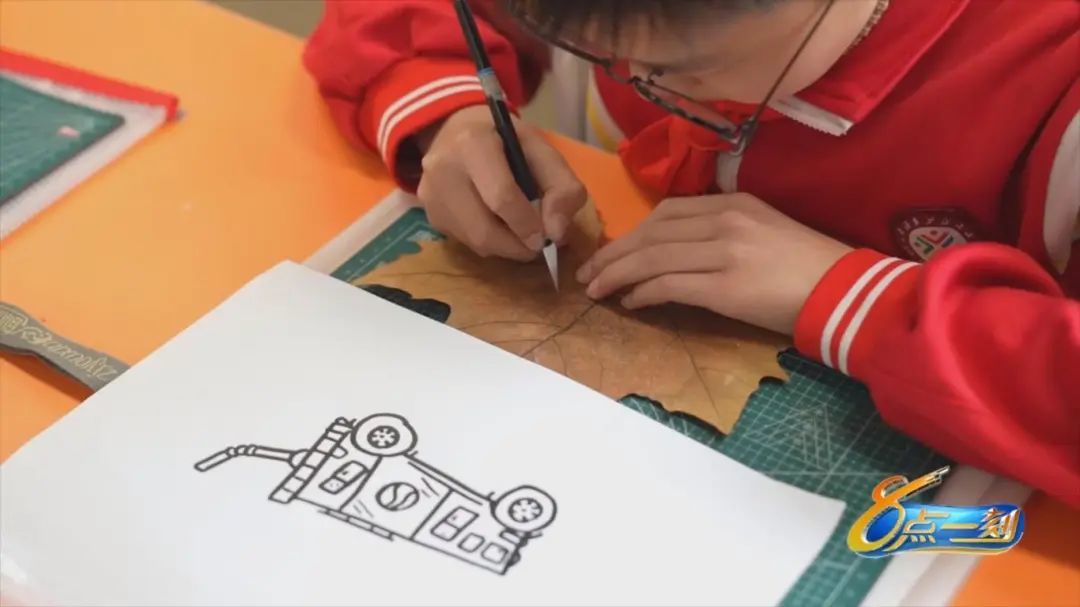课堂上,孩子们围绕特定主题展开了创意构思,并精心绘制出草图,然后再将草图巧妙地印在精心挑选的梧桐叶上,最后,经过细致雕刻,一幅幅富有传统纹样或新奇卡通形象的叶雕作品逐渐成形。