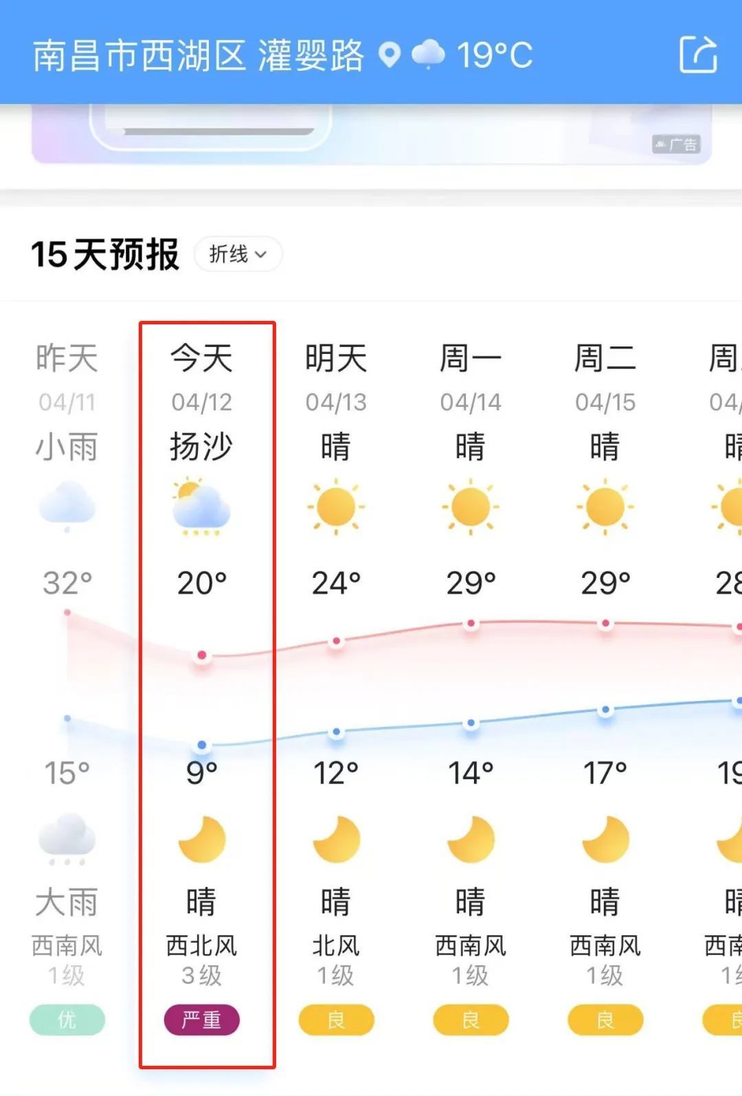 4月12日,南昌受强冷空气大风影响,出现沙尘污染,公众请注意防护。
