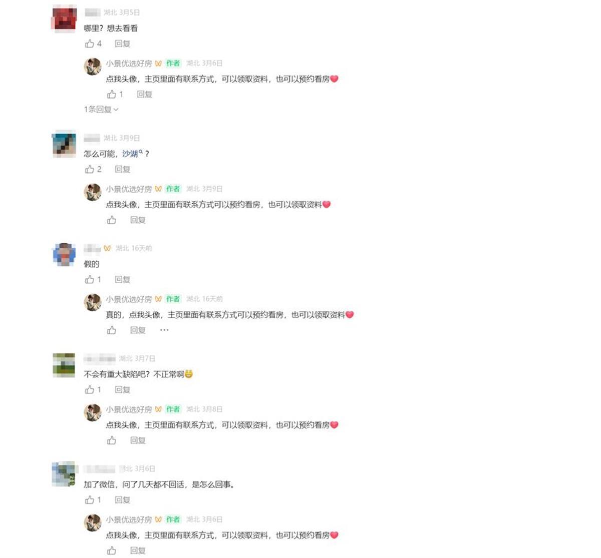 在短视频账号“小景优选好房”发布的这条视频评论区,一众网友纷纷抛出上述疑问,而视频作者的回复也是出奇的一致:“私信预约看房领取资料”。