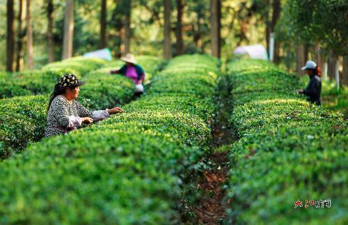 浮梁县臧湾乡新佳茶园,工人在忙着采摘茶叶。江西日报全媒体记者徐铮摄