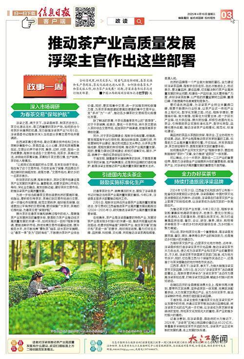 对春季茶叶生产、销售情况的关注,展现了浮梁县委书记对推动当地茶产业高质量发展的重视。今年以来,浮梁县主官多次部署推动相关工作。