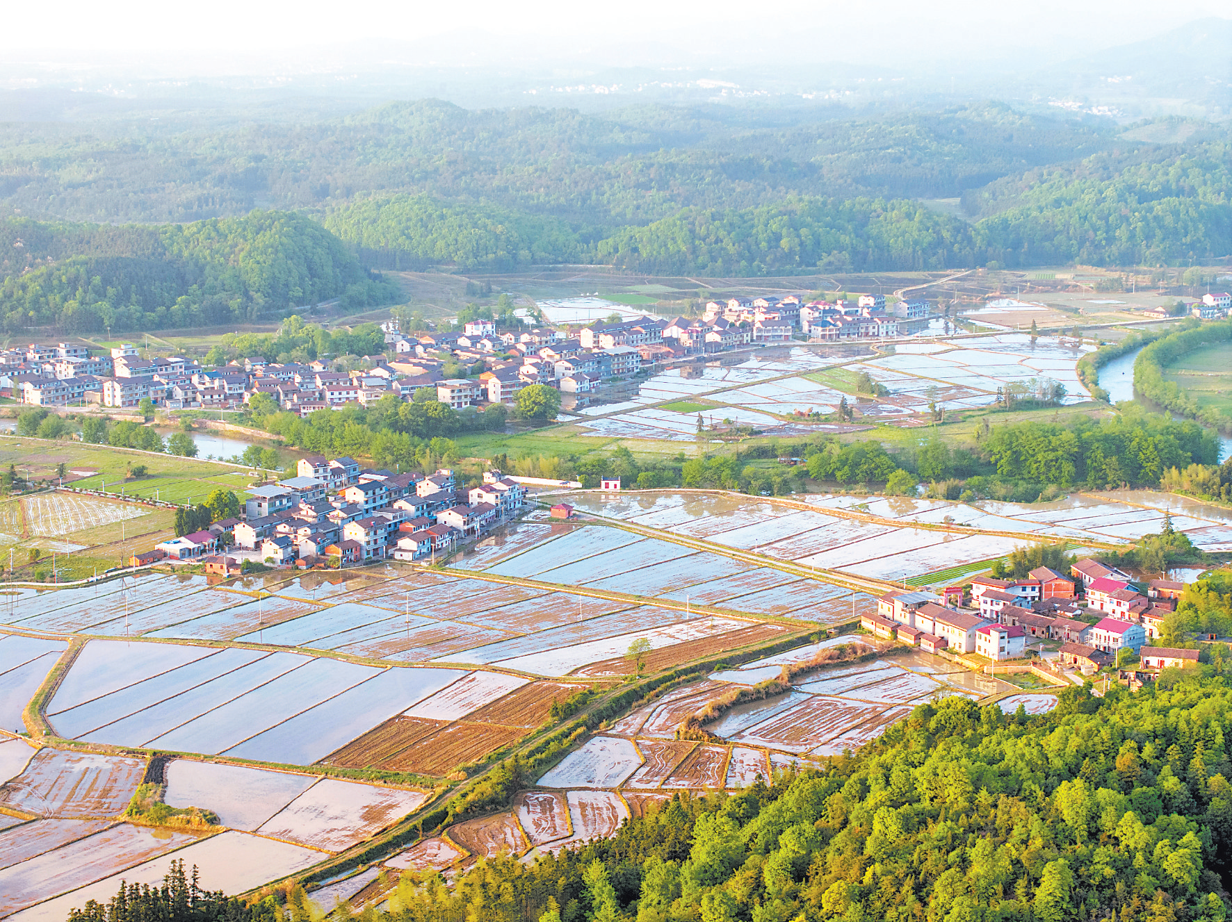 4月14日,金溪县左坊镇汪家村,刚种下早稻的水田如镜面般清澈,倒映着远处的青山、民居与绿树,构成一幅天然的山水田园画卷。