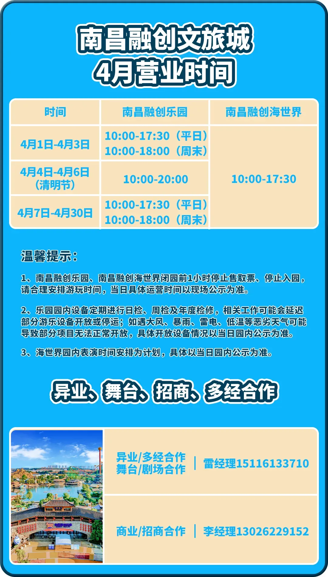 受天气原因影响,为保障游客出行安全及游玩体验,南昌融创乐园2025年4月17日当日临时闭园,南昌融创海世界正常运营。已在网上预订南昌融创乐园门票的游客,可在原渠道申请退款,详情请咨询400-895-9888。