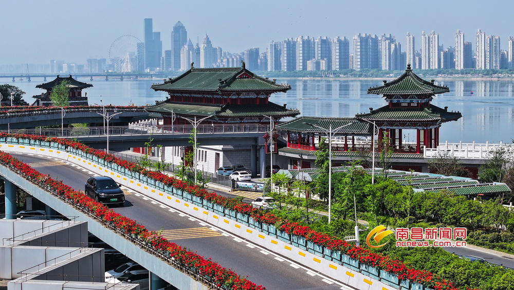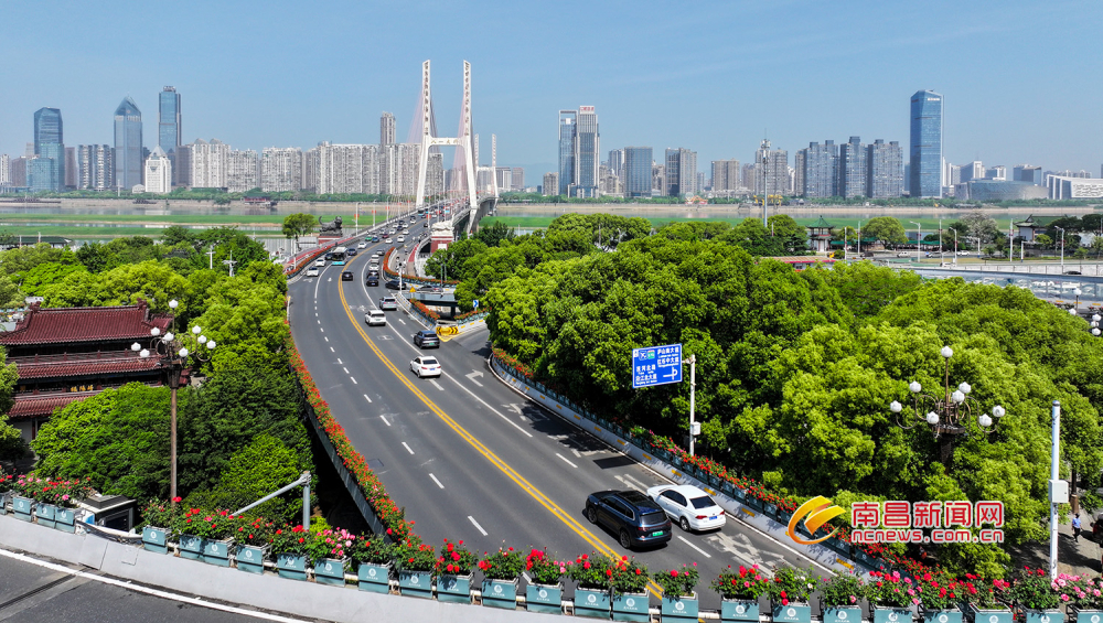 市民游客驱车行驶在大桥上,仿佛在花间穿梭,透过花丛遥望滕王阁和一江两岸地标建筑,尽情享受美妙的春日时光,感受一路花香带来的愉悦心情。(王堃 洪观新闻记者 马悦 文/图)