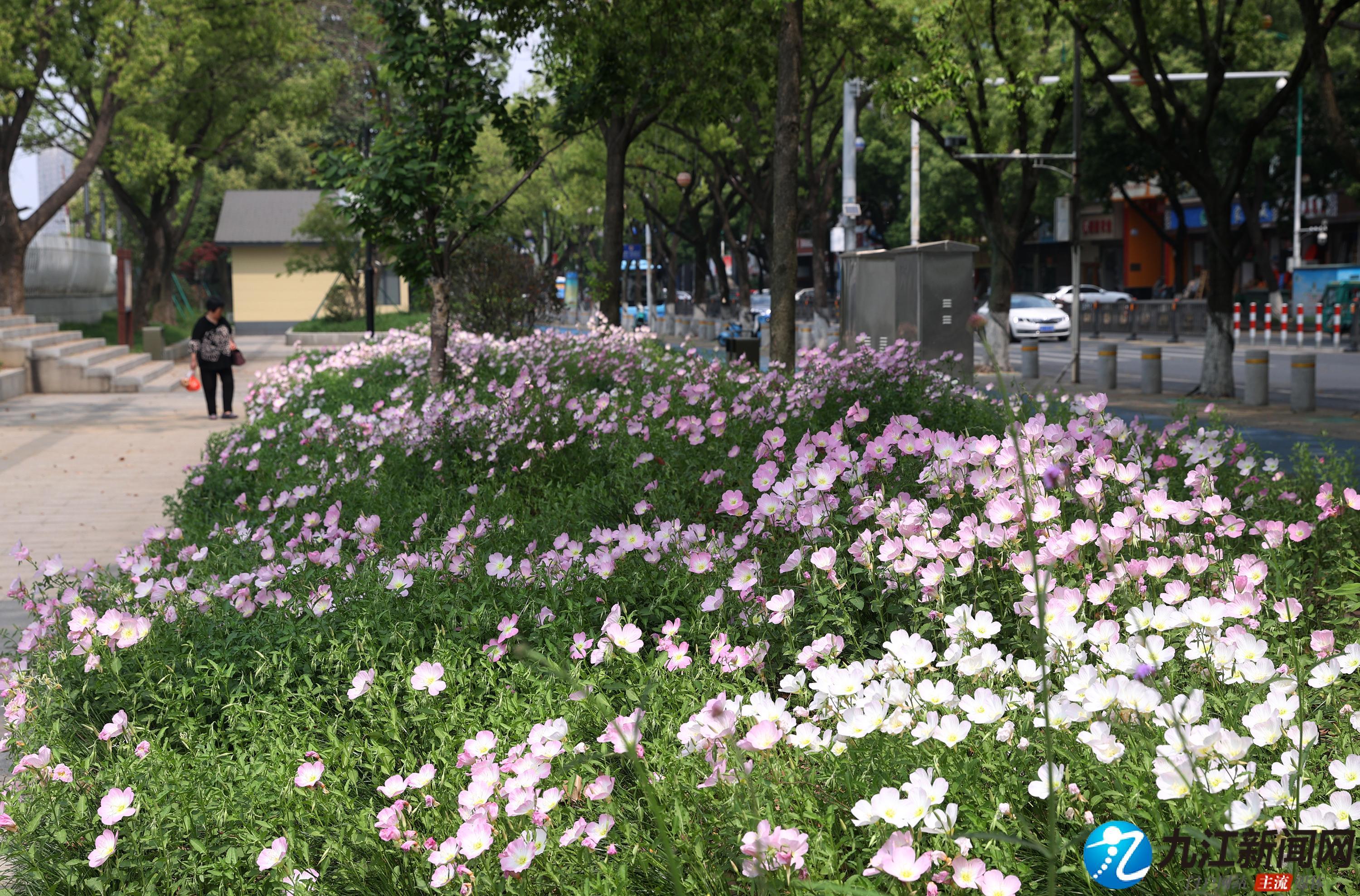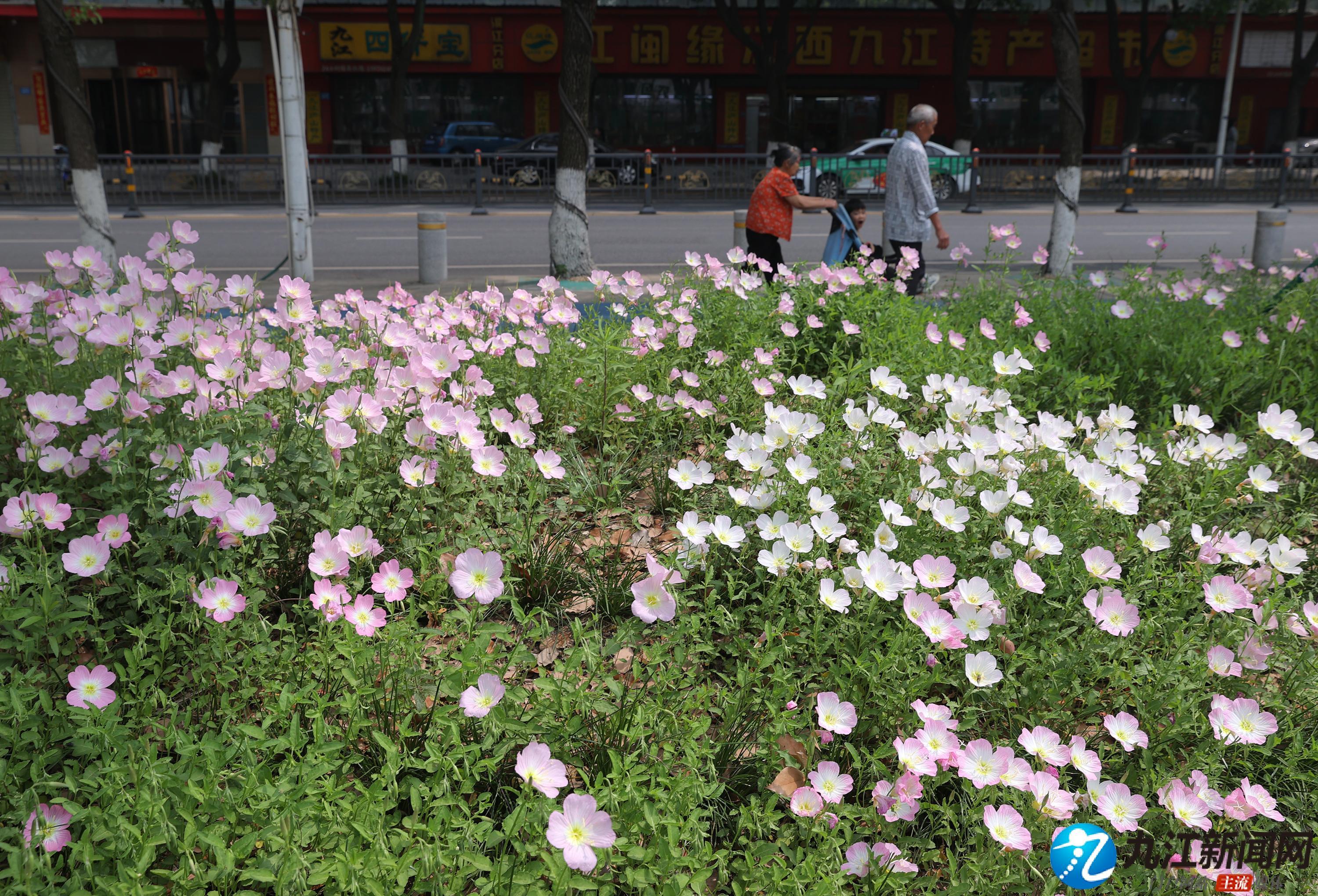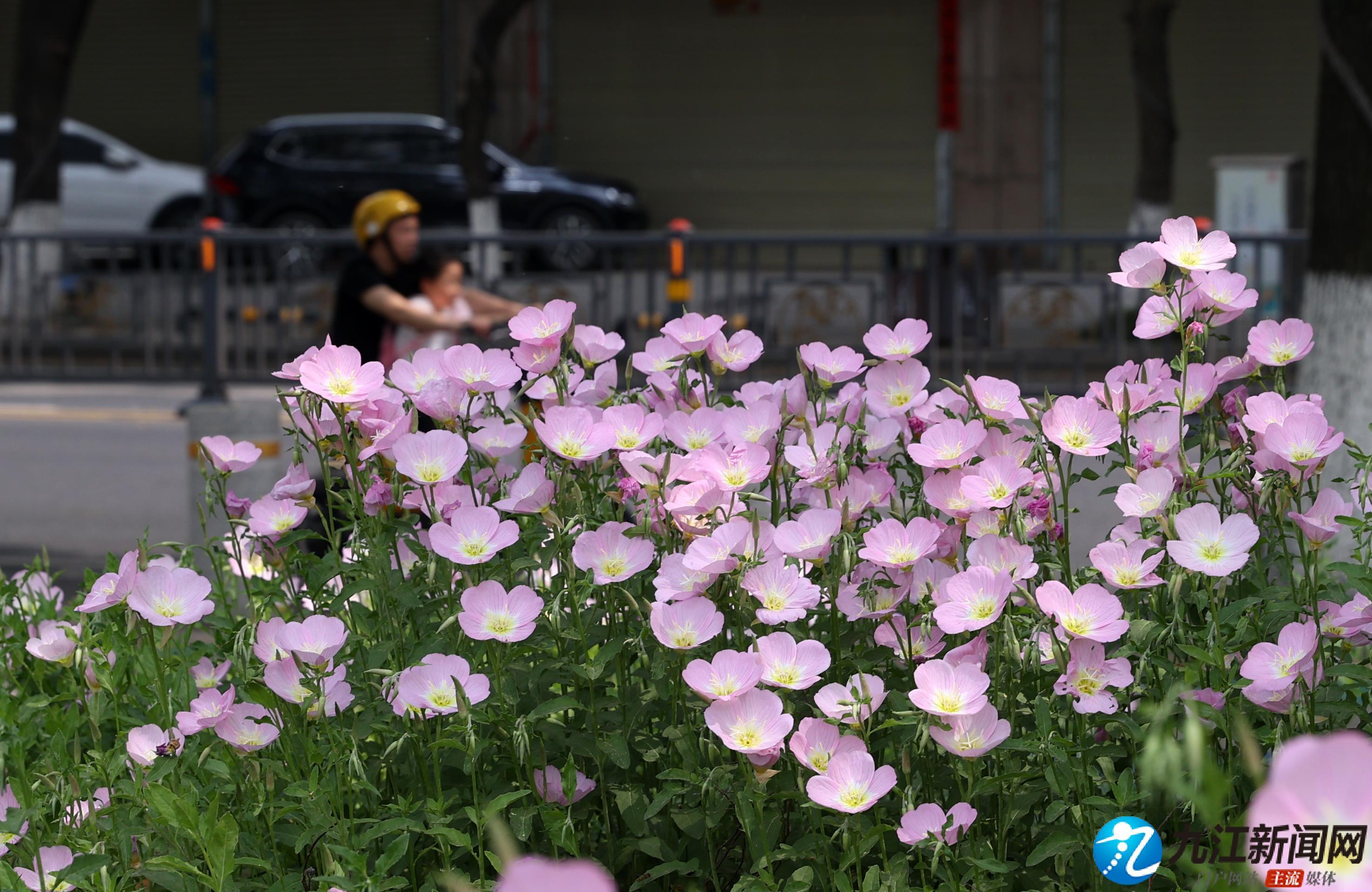 4月20日,位于浔阳区滨江路(九华门遗址附近)绿化带中的美丽月见草绚烂绽放,粉色的花朵如杯盏状,连绵成片、清新脱俗,在扮靓街头的同时也让过往的行人心情舒畅。