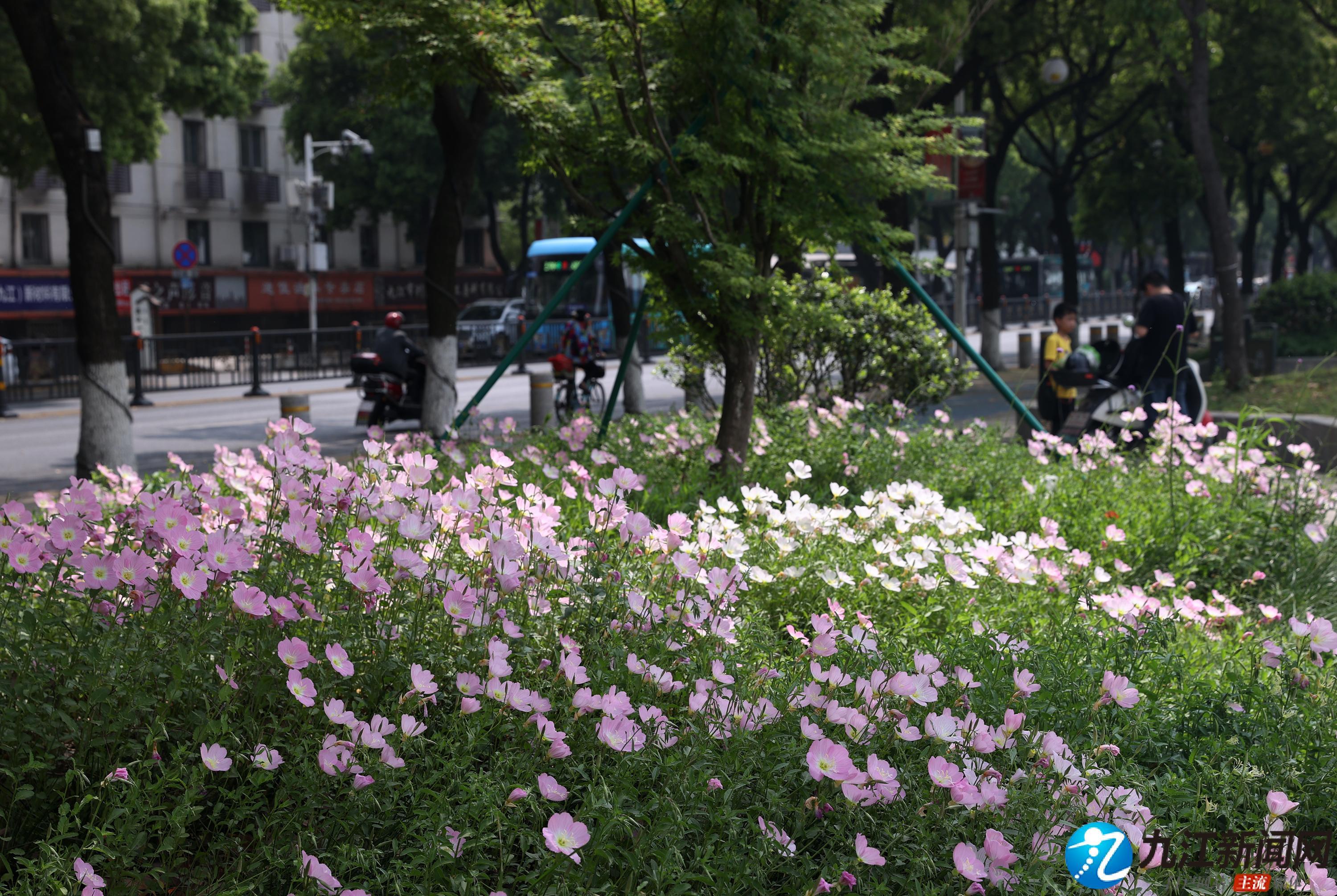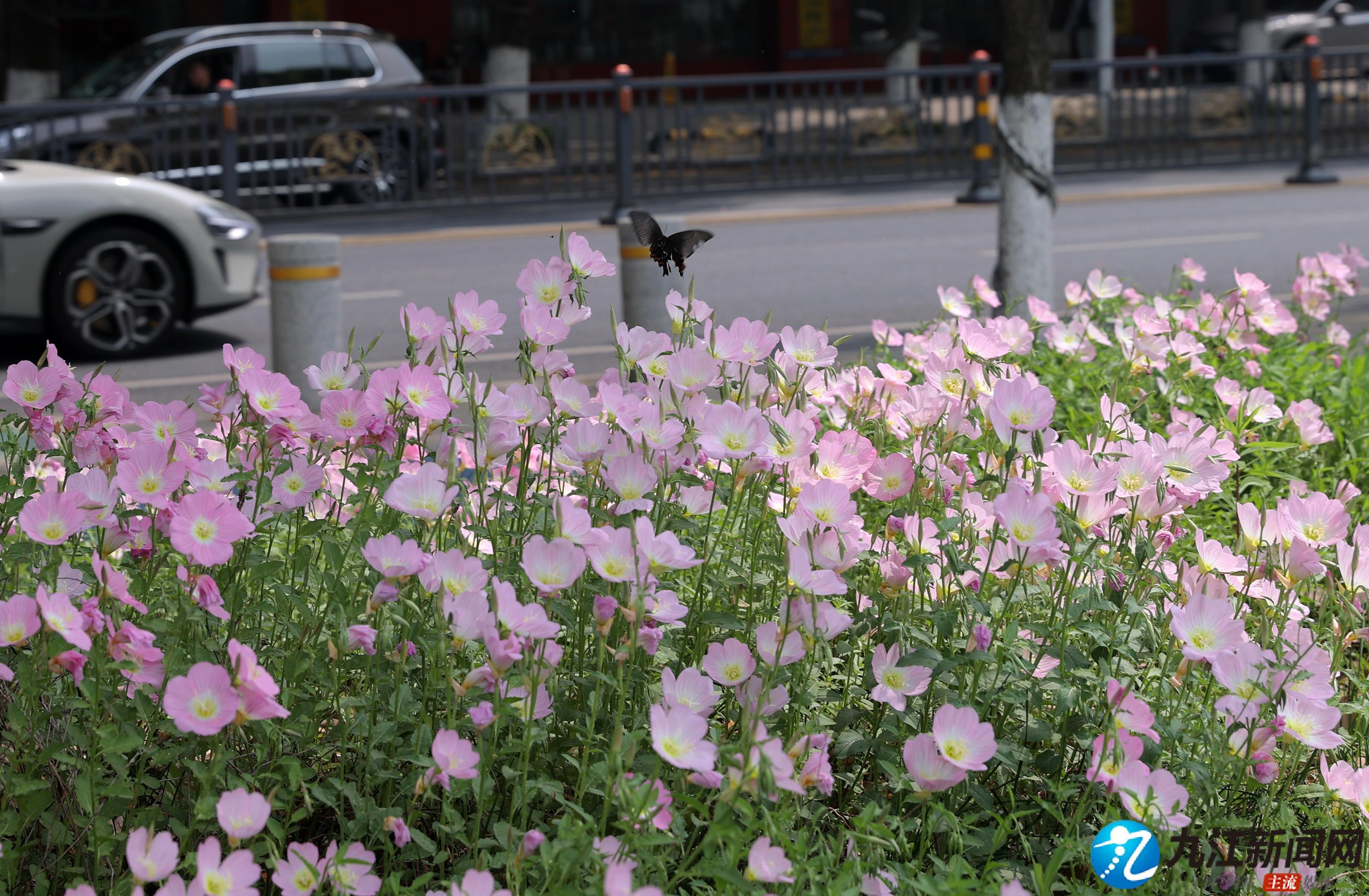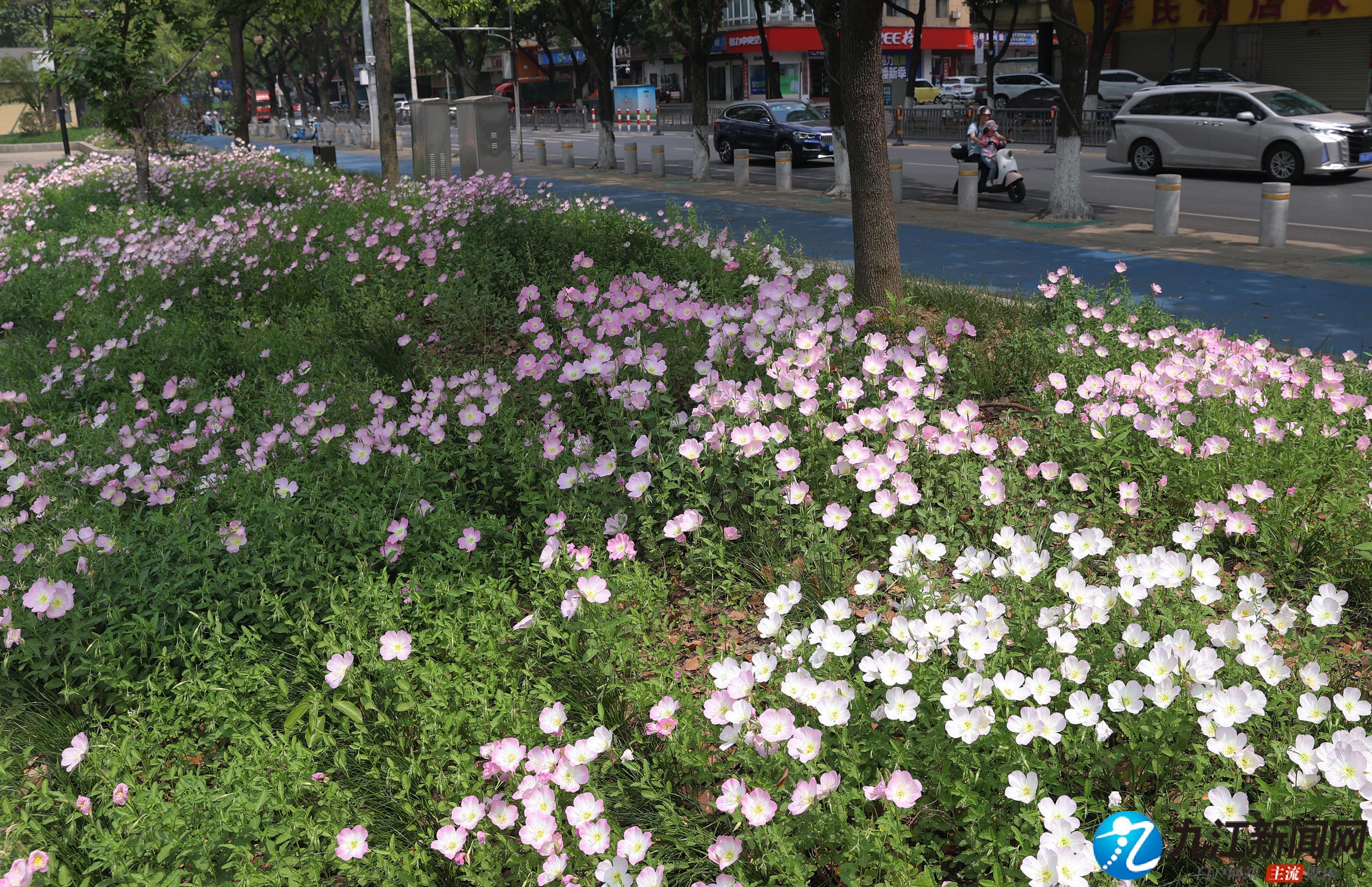 4月20日,位于浔阳区滨江路(九华门遗址附近)绿化带中的美丽月见草绚烂绽放,粉色的花朵如杯盏状,连绵成片、清新脱俗,在扮靓街头的同时也让过往的行人心情舒畅。