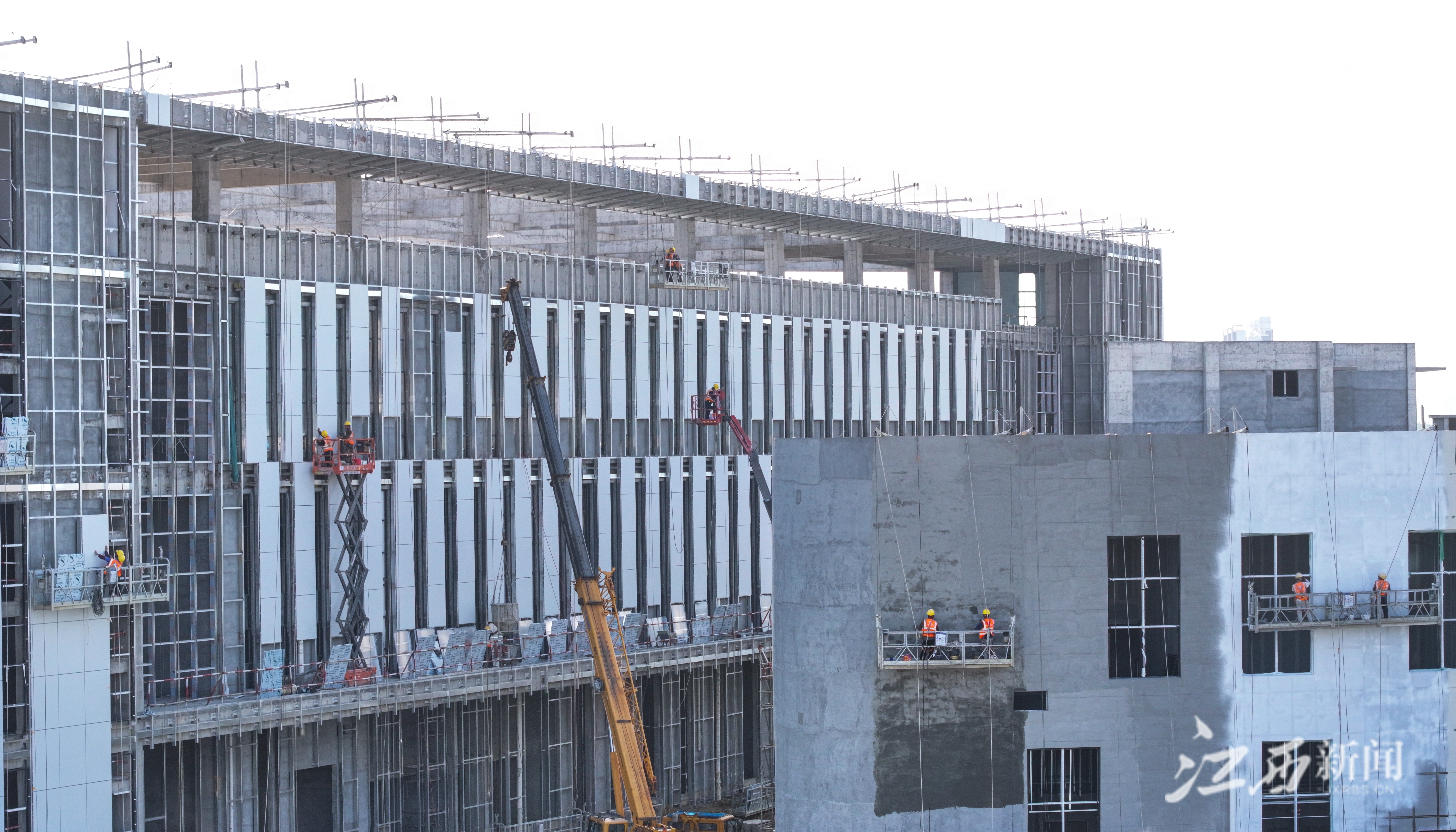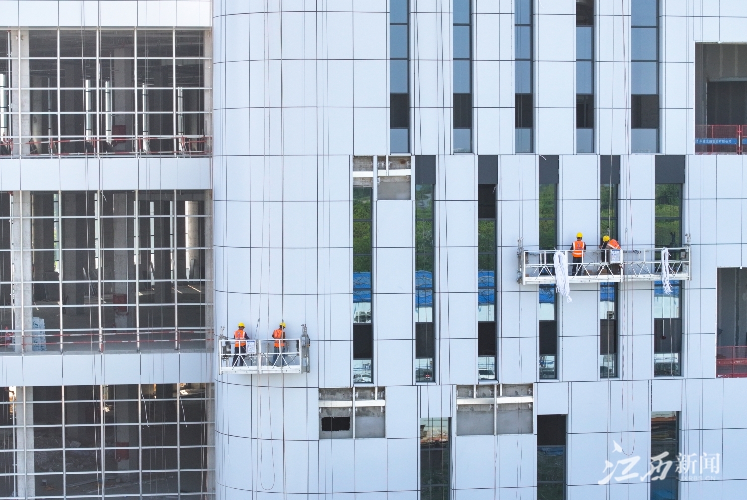 江西新闻客户端讯(江西日报全媒体记者张翰林)4月18日,中建三局施工人员在南昌瑶湖科学岛外墙吊篮上进行幕墙施工。