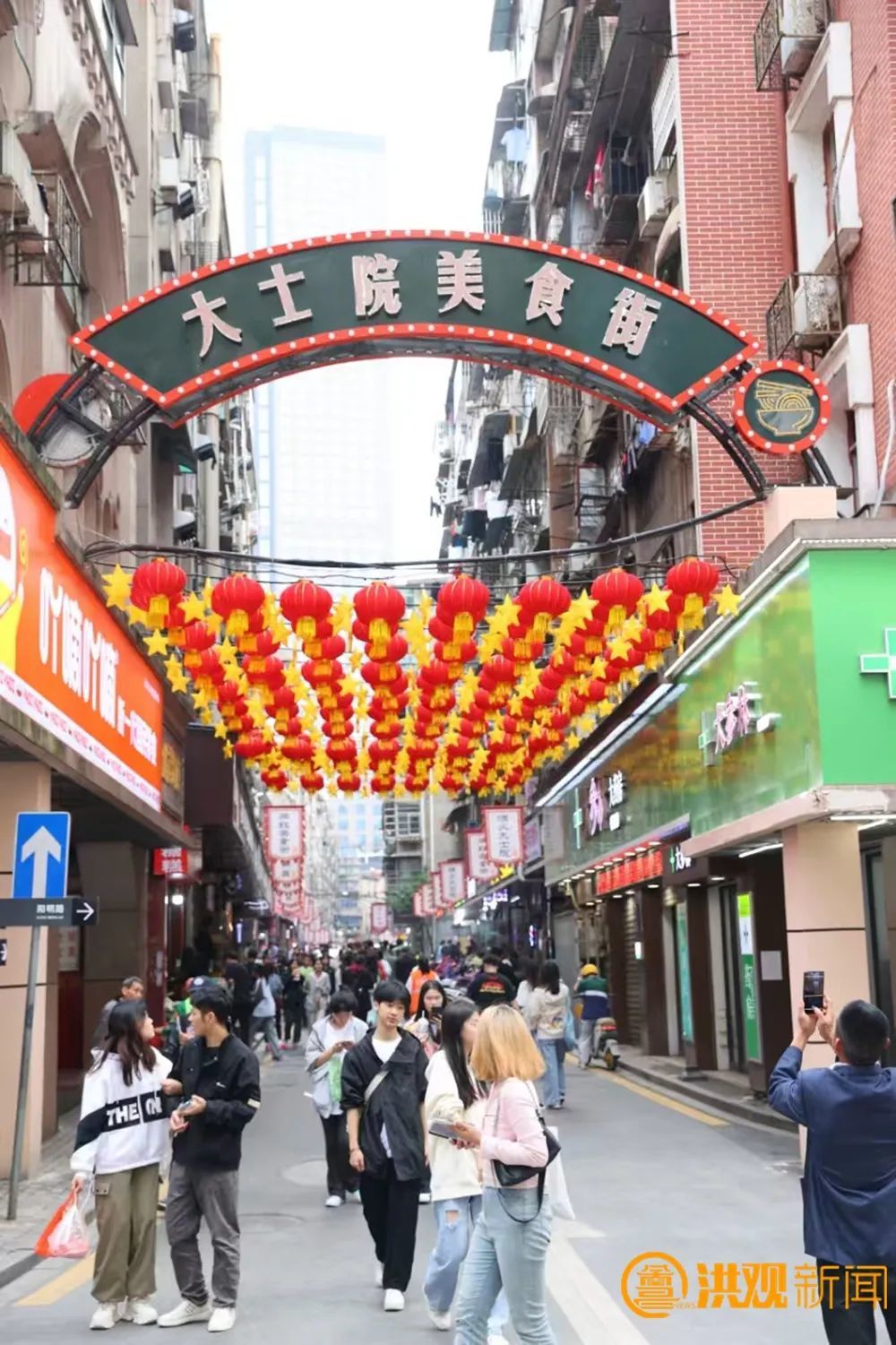 记忆中的色调、复古的店面招牌……走进大士院街区,一家家小店鳞次栉比。改造后的大士院街区焕然一新。复建的百年嘉宾楼重现昔日辉煌,增设的双层挑檐牌楼成为新的地标性建筑。街区按照20世纪八九十年代风貌,绘制了南昌老物件的彩绘文化墙,并专为年轻人设计了多处文创打卡墙。这些元素共同营造出一种怀旧氛围,让游客仿佛穿越时空,回到了那个充满生活气息的年代。