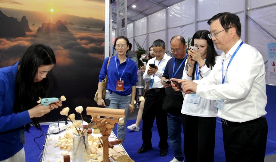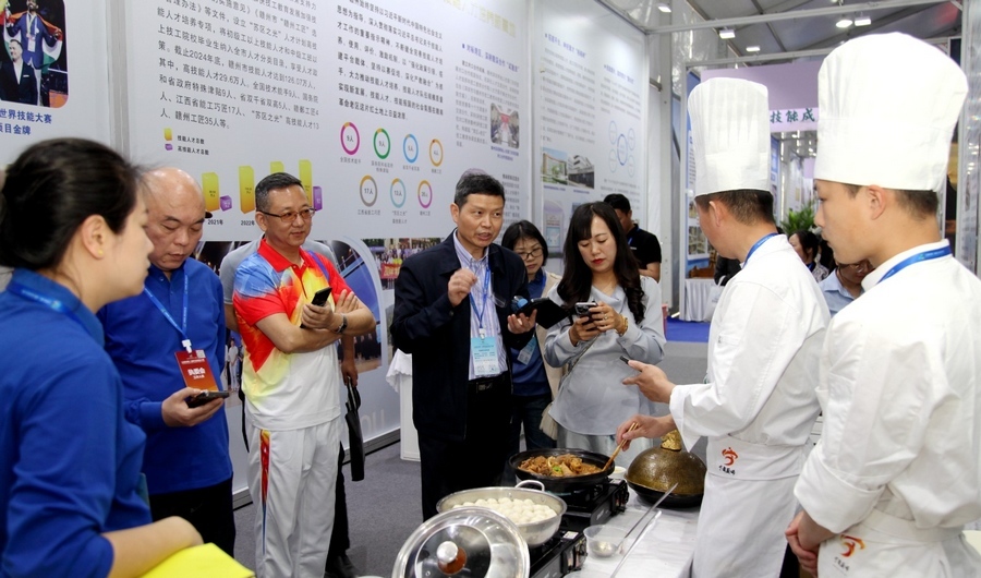 精美的客家瓷画、飘香的宁都三杯鸡、创意十足的刨花手工花束、沁人心脾的山苍籽线香、造型独特的手工锡制茶具……在江西省第二届职业技能大赛期间的技能展示交流活动上,赣州馆内具有浓郁赣南特色的各类技能技艺展示吸引了众多观众驻足观看和体验,沉浸式感受赣南非遗与传统技艺的多元魅力。