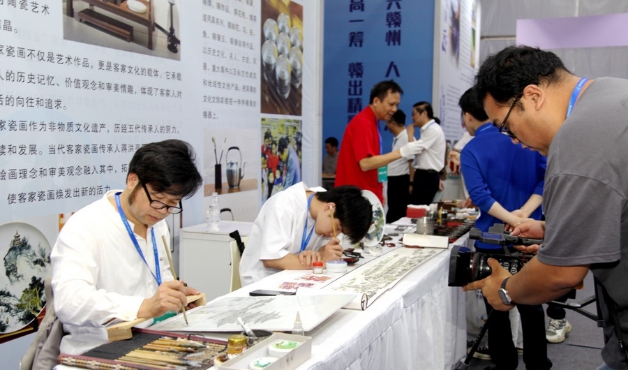 客家瓷画不仅是艺术作品,更是客家文化的载体。在客家瓷画展区,赣州市技能大师工作室领办人蒋洪亮正手持画笔,在白色瓷板上勾勒文昌阁。细腻的笔触下,一座造型清幽、结构精巧的六边形文昌阁跃然“瓷”上,引得观众纷纷拍照赞叹。“我们将现代绘画理念和审美观念融入瓷画创作,拓展了瓷画的题材和表现形式,并将瓷画与现代家居美学融合,使客家瓷画焕发出新的活力。”蒋洪亮介绍道。