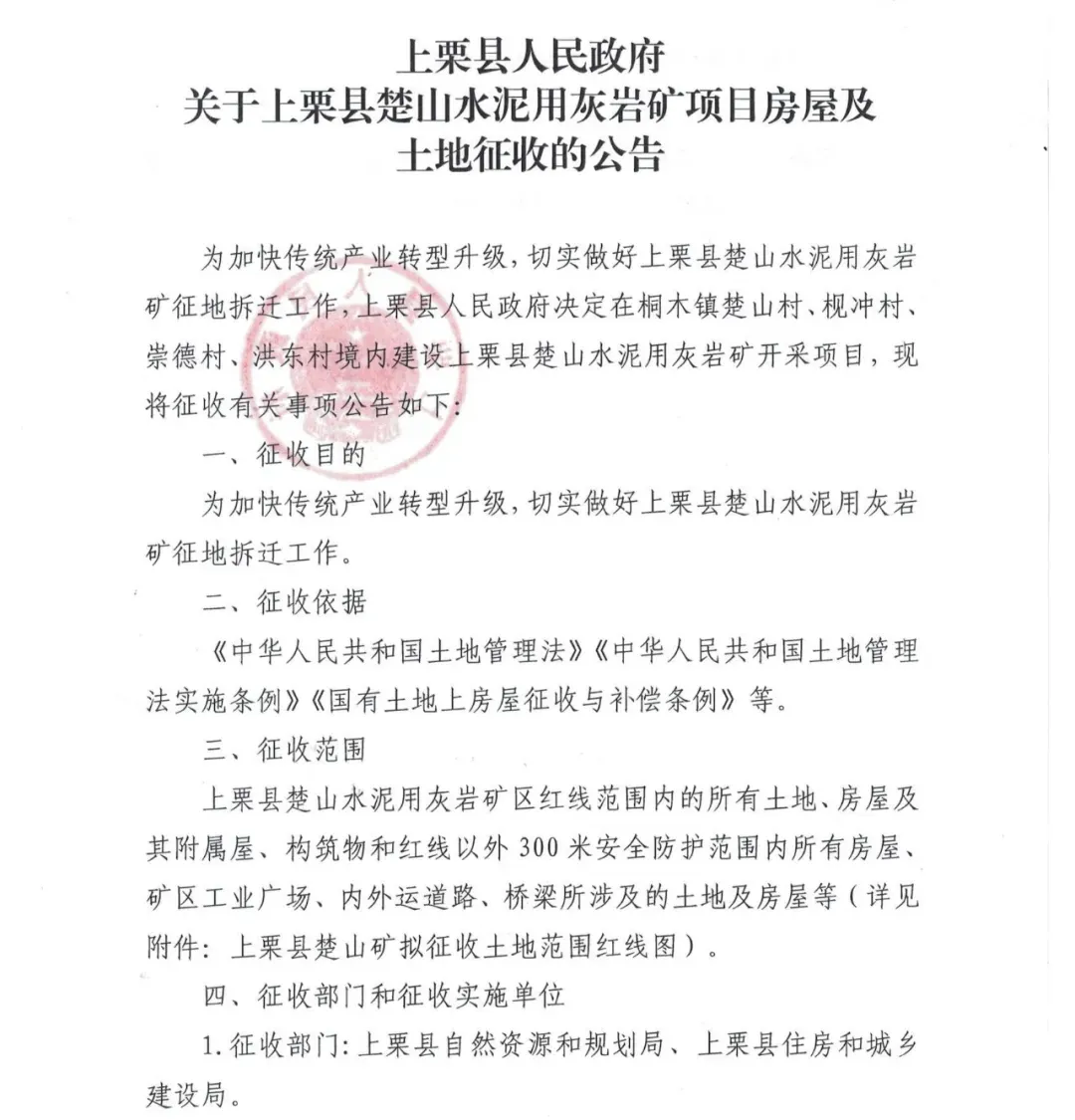 为加快传统产业转型升级,切实做好上栗县楚山水泥用灰岩矿征地拆迁工作,上栗县人民政府决定在桐木镇楚山村、枧冲村、崇德村、洪东村境内建设上栗县楚山水泥用灰岩矿开采项目,现将征收有关事项公告如下:
