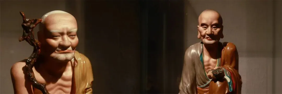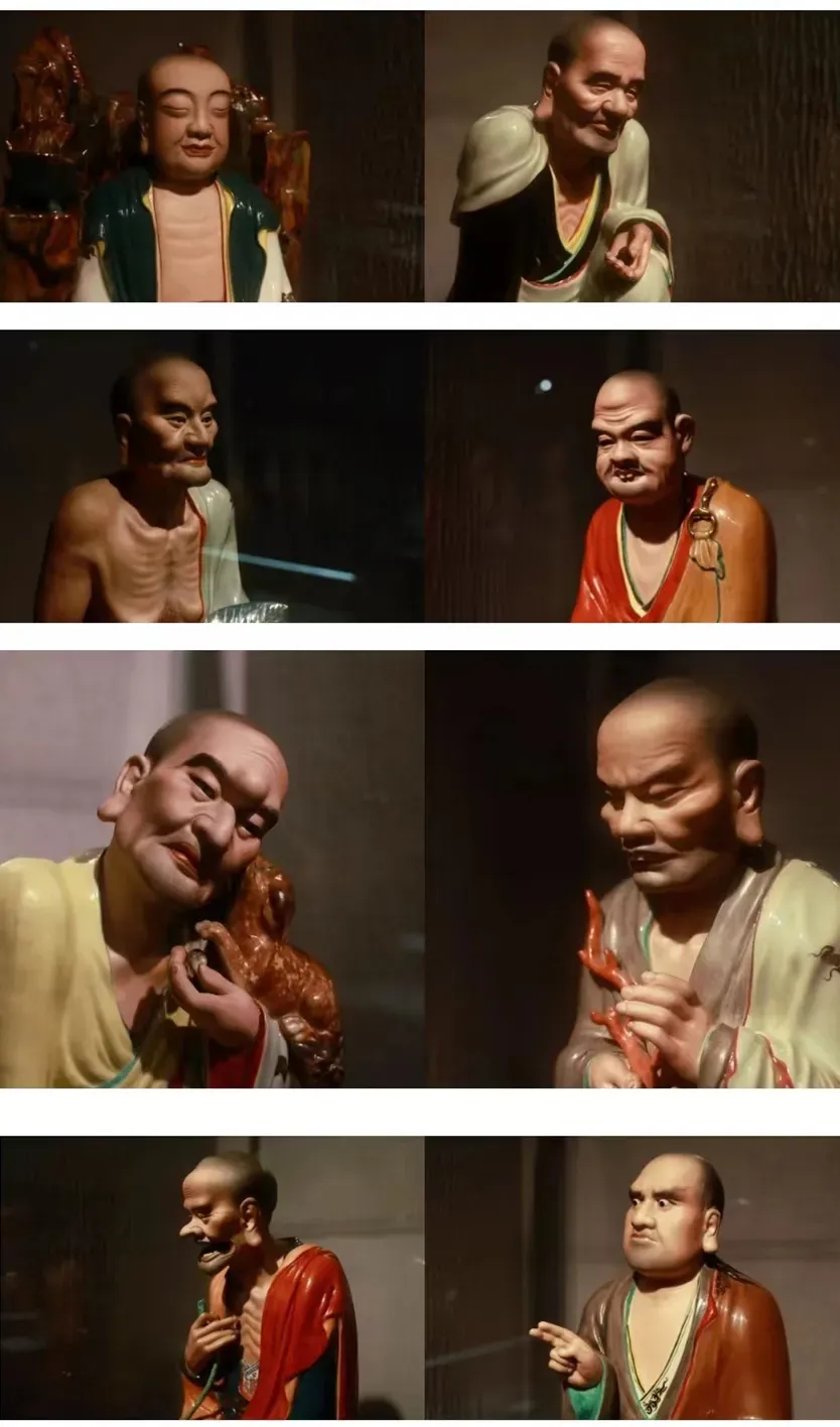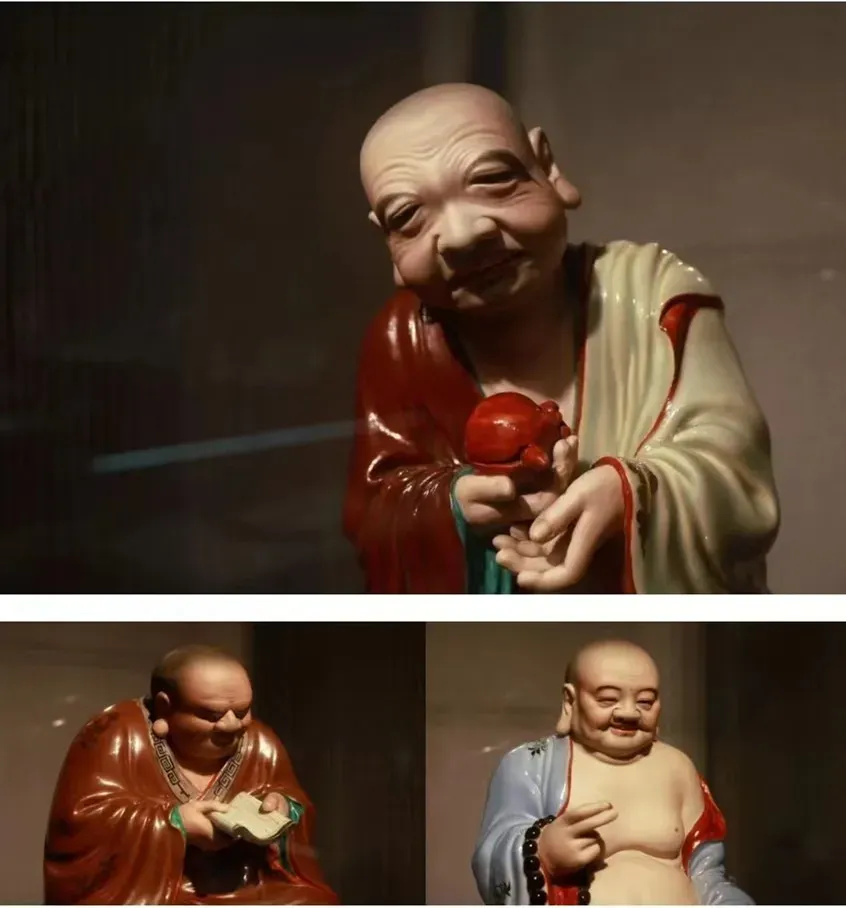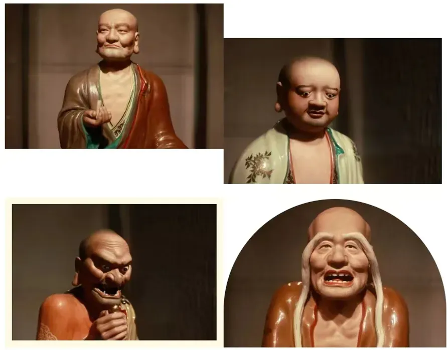 这些釉下加彩十八罗汉塑像的作者是曾龙升,字龙生,1900—1964,江西丰城人。其为景德镇瓷雕艺术的一代宗师,作品手法精巧,形象传神。