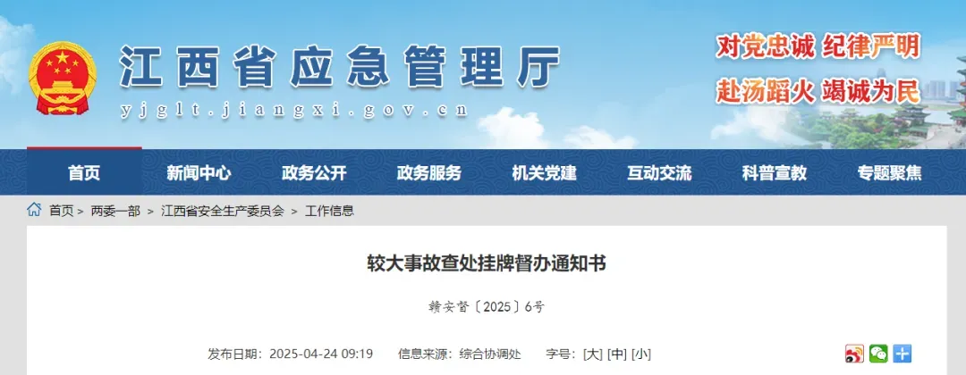 2025年4月19日,在你市铅山县汪二镇一粮食风干厂发生一起亡人事故,造成3人死亡。根据《中共江西省委、江西省人民政府关于推进安全生产领域改革发展的实施意见》(赣发〔2017〕27号)、《江西省生产安全事故报告和调查评估办法》(赣府厅发〔2022〕38号)和《江西省生产安全事故提级调查与挂牌督办办法》(赣安〔2020〕15号)等有关规定,省安委会决定对该起事故查处实行挂牌督办。