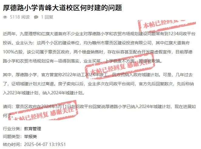 经核实,来文提到的赣州市厚德路小学青峰大道校区由我公司代建,已将该项目纳入本年度项目建设计划。项目目前正在逐步开展前期工作,其规划方案已报相关部门进行审核并通过专家评审,将争取尽快开工建设。