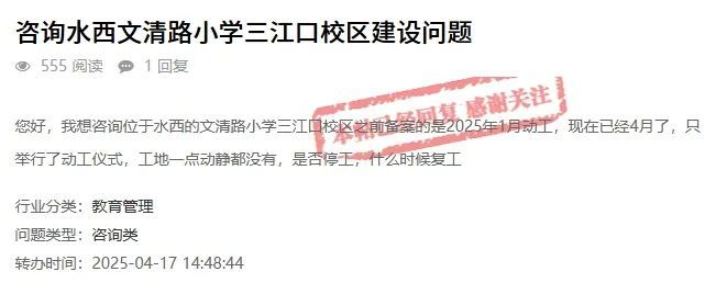 经核实,来文提到的赣州市文清路小学三江口校区建设项目由我公司代建,已将该项目纳入年度项目建设计划。项目目前正在按程序进行前期工作,将争取尽快开工建设。