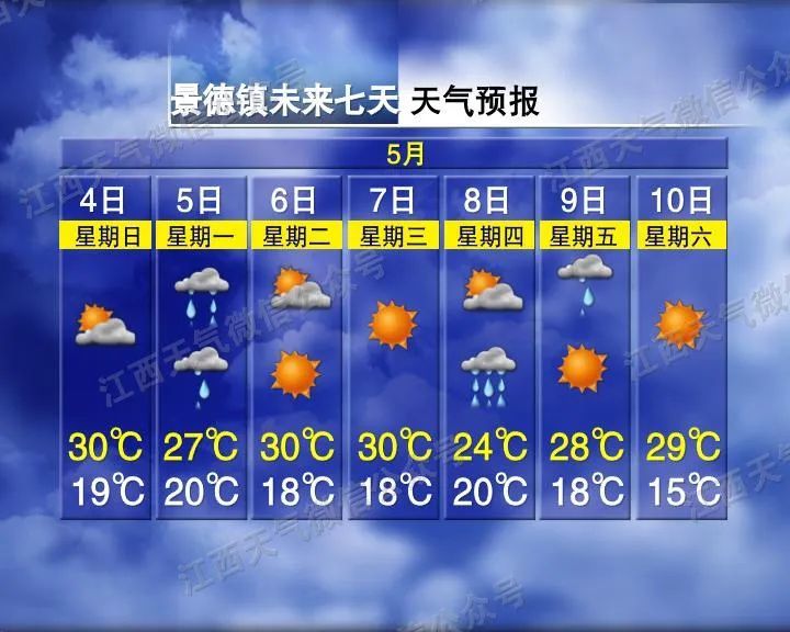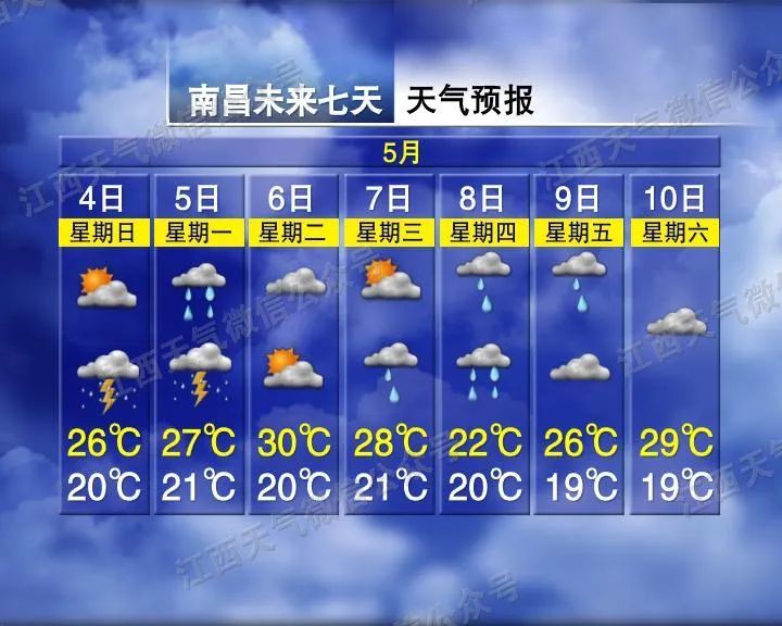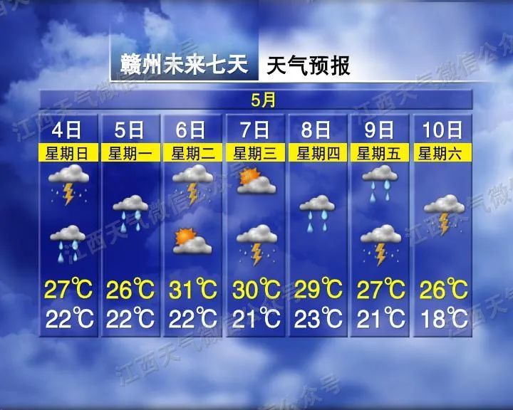 赣北南部、赣中和赣南北部阴天有中到大雨或雷雨,局部地区有暴雨,并伴有强雷电、短时强降水等对流性天气;赣北北部和赣南南部阴天有中雨或雷雨,局部地区有大雨。