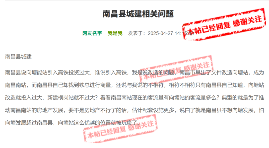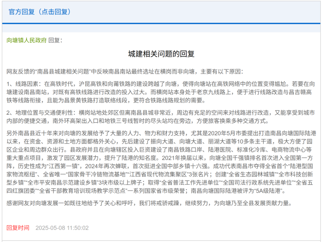 近日,有网友在问政江西平台留言提出建议,为何不对向塘火车站进行升级,调整为南昌南站,提升向塘片区的发展。