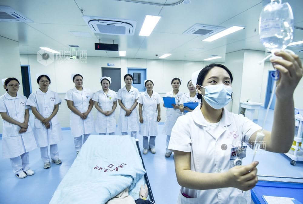 5月10日,江西省人民医院资溪医院女护士在新医技大楼进行岗位练兵,交流静脉输液经验。 特约通讯员 吴志贵摄