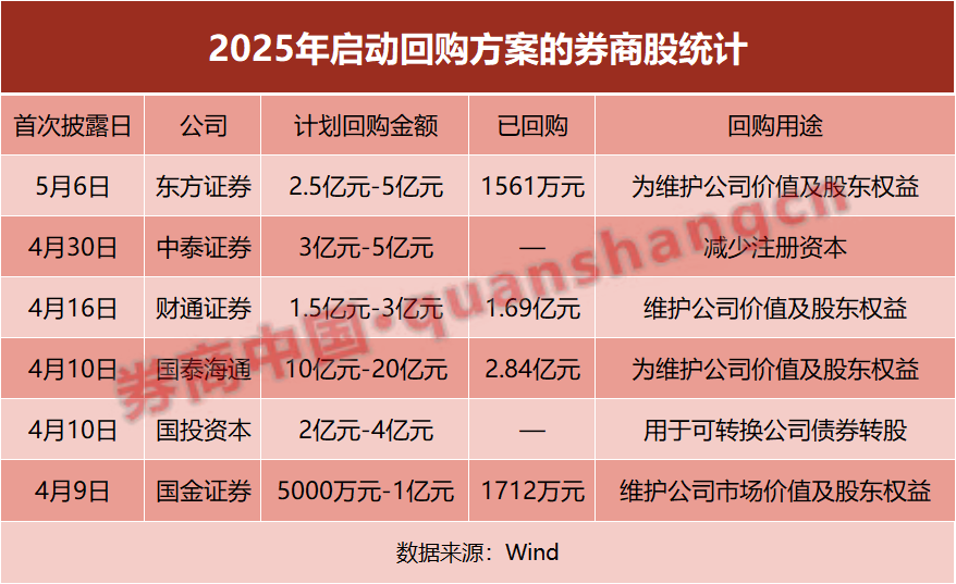 在红塔证券之前,今年已有6家券商公布了回购方案。行动最早的国金证券,其在4月8日国务院国资委发声后,第一时间公告的新一轮回购股份方案——此前在2024年,国金证券已经进行过两轮回购,分别用于股权激励和注销。