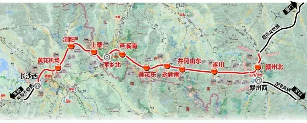 根据规划,长赣高铁将在长沙设云贵厦联络线、西南联络线,经长沙南站连通沪昆高铁、京广高铁;在萍乡设渝长沪联络线,通过沪昆高铁沟通上海方向;在赣州接入赣州西站,通过赣深高铁通深圳方向。