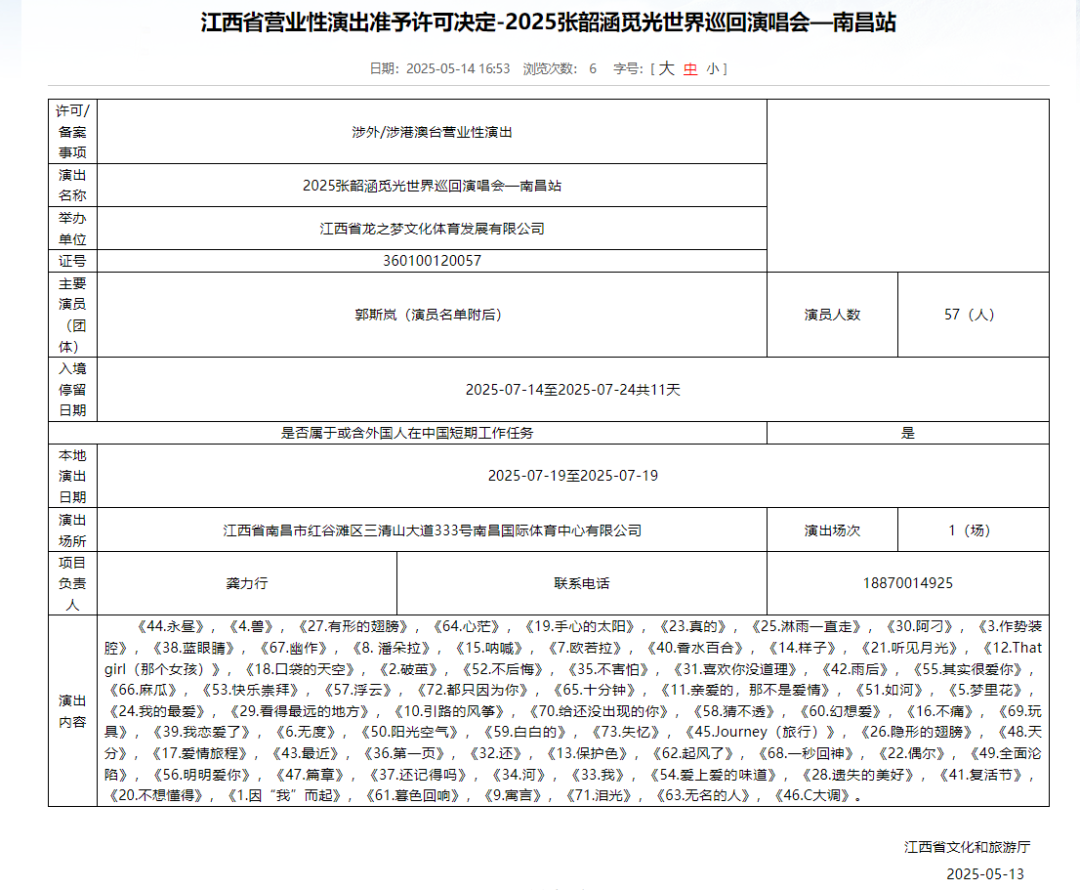 除此之外,2025张韶涵觅光世界巡回演唱会一南昌站也已经获批,本地演出开始时间为2025-07-19。