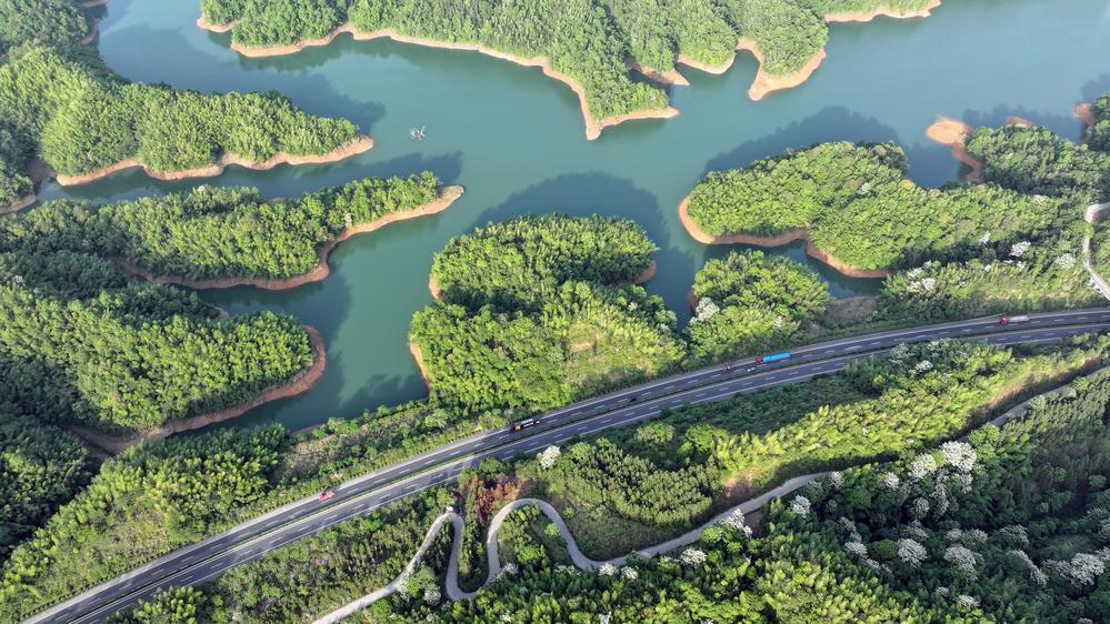 初夏时节,宜丰县新昌镇板坑水库的碧绿湖水和四周的葱郁山林,与大广高速、旅游公路相映成景。近年来,该县持续推进山水资源保护、公路设施完善、秀美乡村建设,推动乡村旅游发展壮大,助力乡村振兴。 (何贱来 晏结仲 摄)