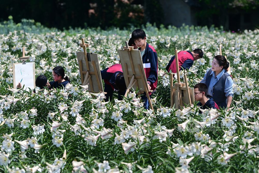 2025年5月14日,学生在江西省宜春市万载县白水乡文义村百合花基地写生。江西省宜春市万载县白水乡中小学校依托周边的田园,充分利用美术课、综合实践课等时间,组织学生走进百合花田间写生,用画笔描绘美丽夏日景色。 来源:大江网-视觉江西 邓龙华 摄