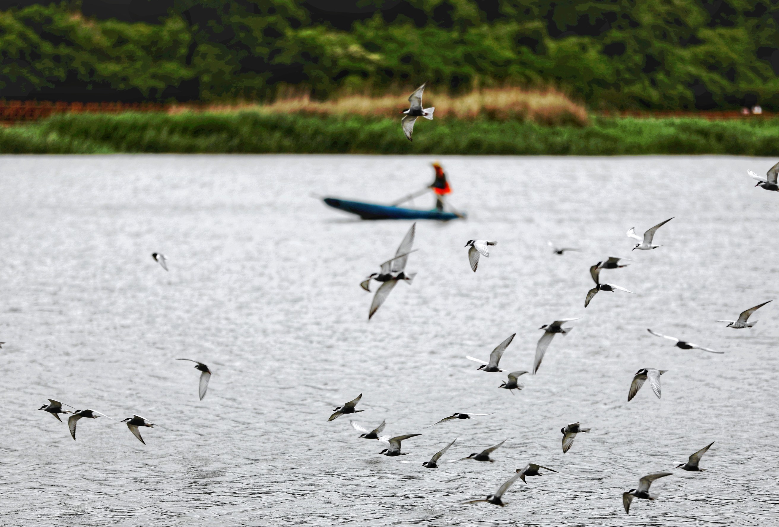 5月10日,分宜县介溪湿地公园,成群的候鸟——须浮鸥正在水面上嬉戏觅食。近年来,当地持续加大修复和保护湿地生态的力度,为鸟类种群提供良好的栖息环境,生物多样性不断丰富,吸引不少候鸟在此栖息。通讯员 袁建兵摄