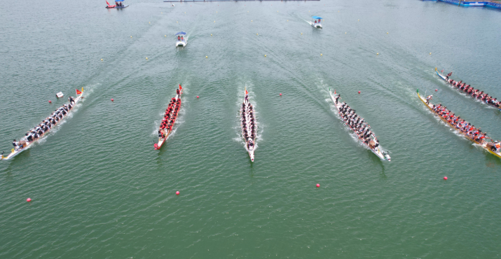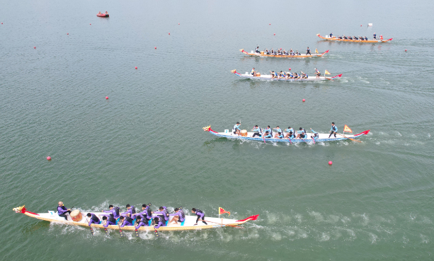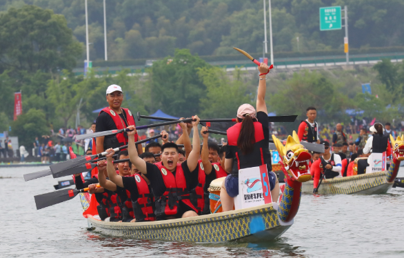 水光潋滟,鼓声激越。5月17日上午的蔡家湖畔,鼓声如雷,赛道上六支龙舟同时列阵。红黄浮球每隔20米漂浮水面,清晰标示赛道长度,观众在岸边热情观战,呐喊助威声此起彼伏。现场不少市民清晨即携家带口前来观赛,“带孩子来看比赛,既能感受传统文化,又能体验现代体育的激情!”一位市民举起手机记录下冲线瞬间,笑称“朋友圈已被龙舟刷屏”。
