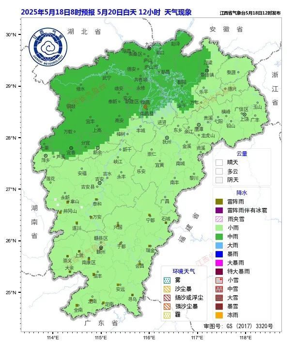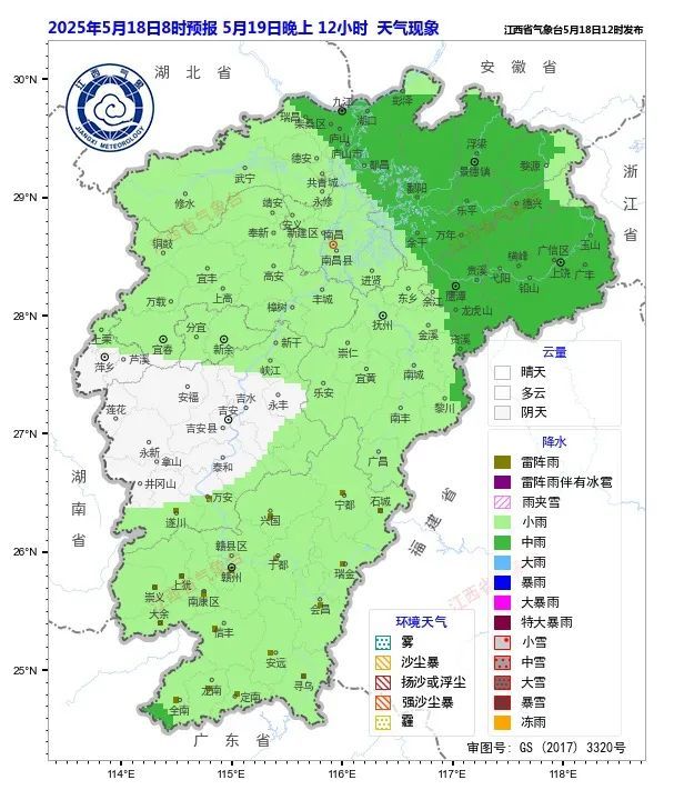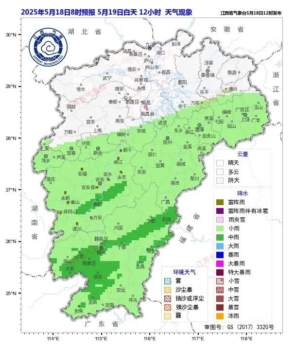 赣北赣中阴天有阵雨转中雨或雷雨
