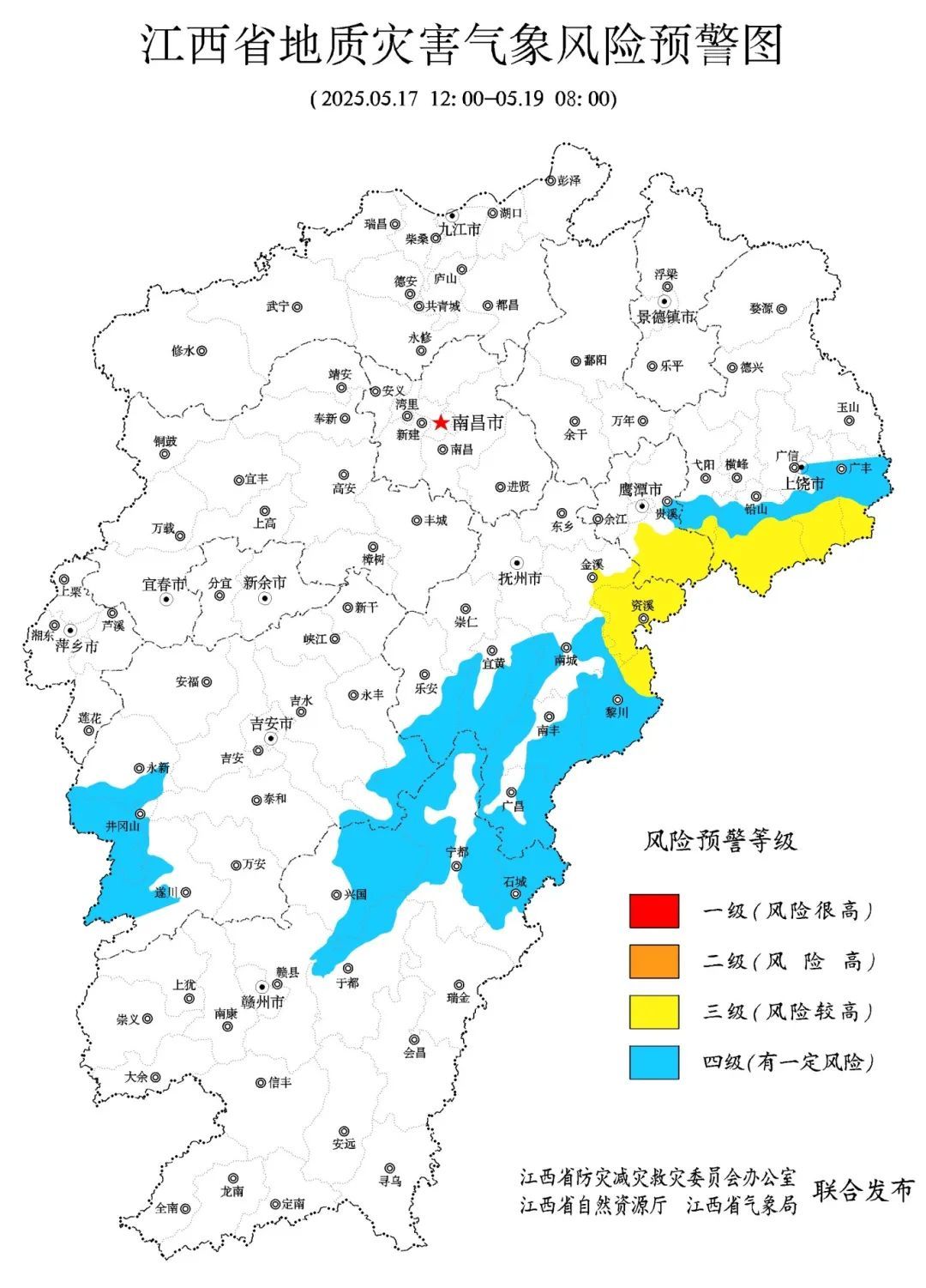 上饶市南部局部、抚州市南部、吉安市西部、赣州市东北部等地质灾害高易发区和部分中易发区,有出现小型崩塌、滑坡、泥石流灾害的一定风险(蓝色预警)