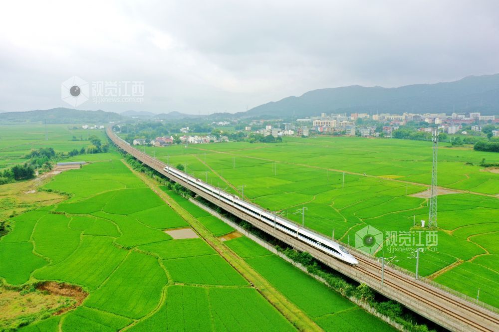 近年来,江西省吉安市峡江县牢固树立和践行绿水青山就是金山银山理念,把美丽乡村建设与生态环境保护有机结合,不断扮靓农村环境“新颜值”,努力绘就乡村振兴新画卷。2025年5月19日,江西省吉安市峡江县水边镇众村境内,高铁列车飞驰在广阔的绿色田园间,与稻田、村庄、青山相映成景,勾勒出一幅“丰”景无限好的夏日田园画卷。 视觉江西 宋靖辉 摄