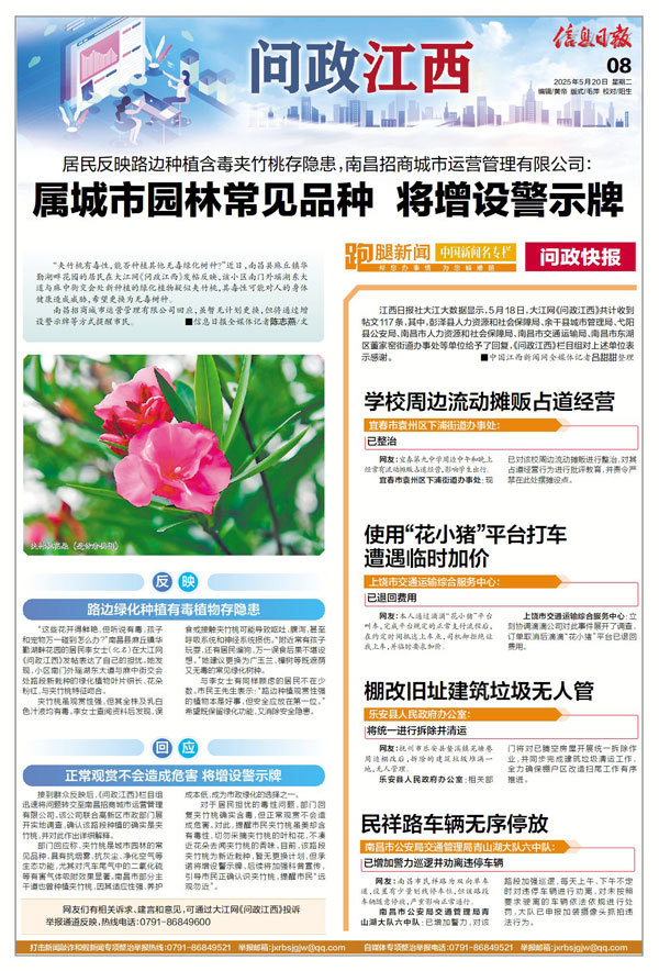对于居民担忧的毒性问题,部门回复夹竹桃确实含毒,但正常观赏不会造成危害。对此,提醒市民夹竹桃虽美却含有毒性,切勿采摘夹竹桃的叶和花,不凑近花朵去闻夹竹桃的香味。目前,该路段夹竹桃为新近栽种,暂无更换计划,但承诺将增设警示牌,后续将加强科普宣传,引导市民正确认识夹竹桃,提醒市民“远观勿近”。