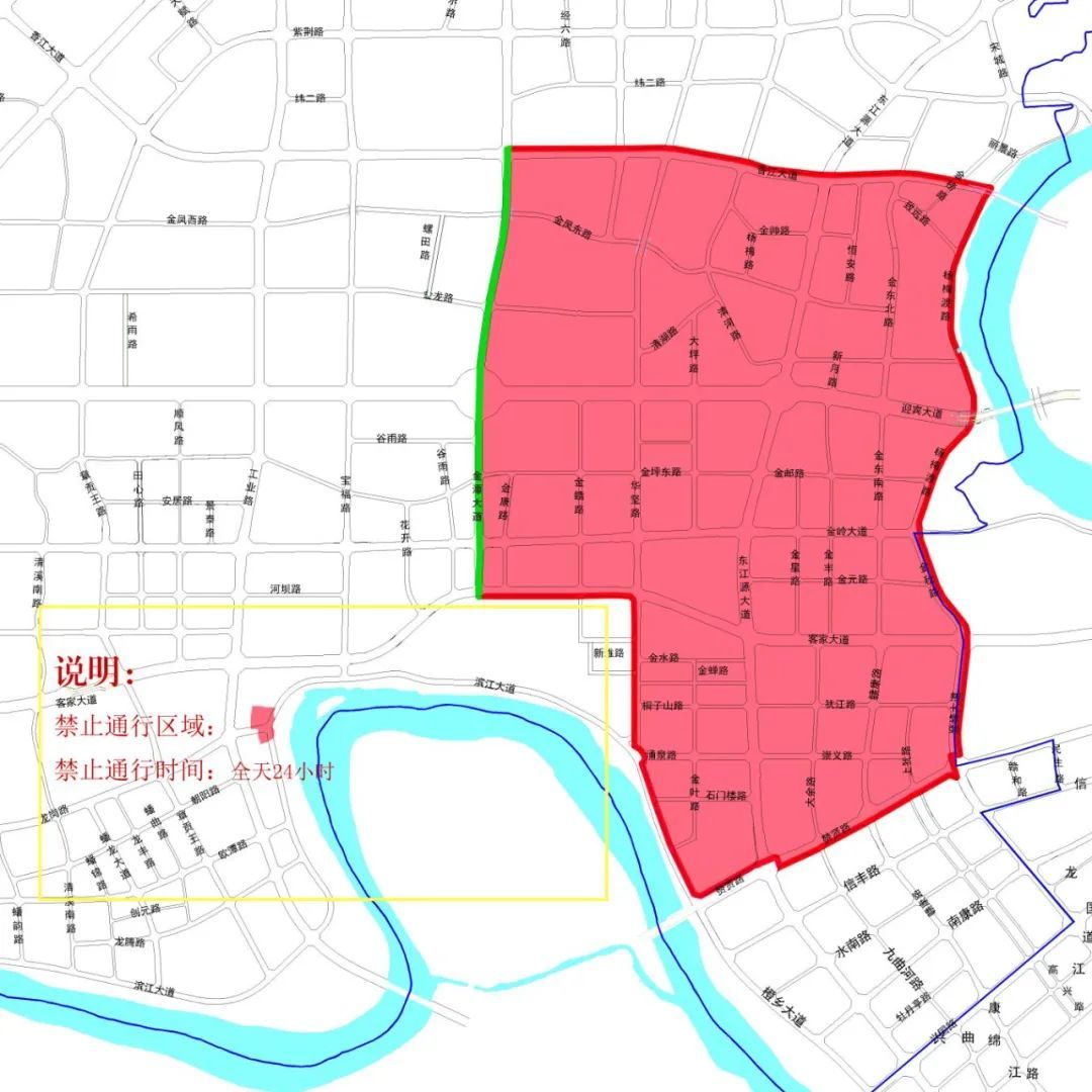 金潭大道(不含)、华坚路(含)和金叶路滨江大道(不含)以东,香江大道(含)以南,杨梅渡路(含)、金秋路(含)和登峰大道(含)以西,赞贤路(含)以北的围合区域(赞贤路(东江源大道至黄金大桥桥头段)不在限行范围内)。