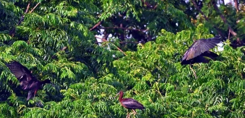 5月22日,江西鄱阳湖国家级自然保护区吴城保护管理站、沙湖保护管理站巡护员联合开展鄱阳湖夏季候鸟调查监测时,在鄱阳湖保护区周边的永修县水域发现有着“湿地彩虹”之称的国家一级保护动物彩鹮。监测过程中,4只彩鹮正从附近农田和树林中收集树枝,带回水域中心的树林进行筑巢,场面十分有趣。