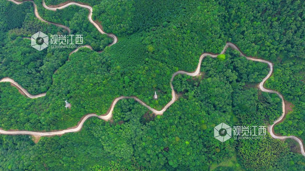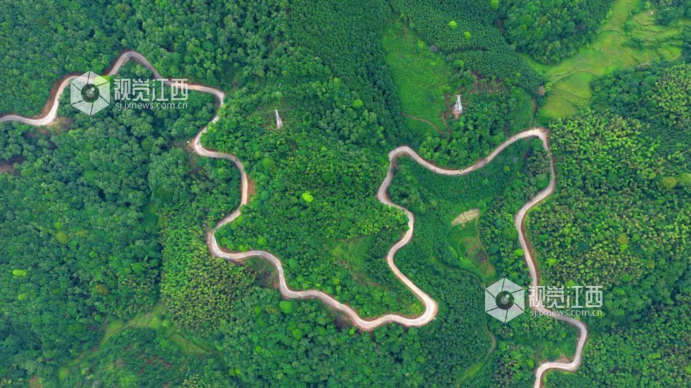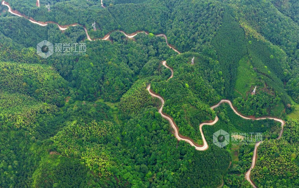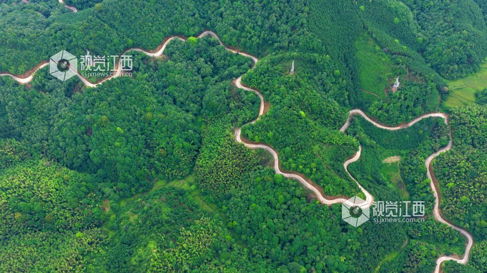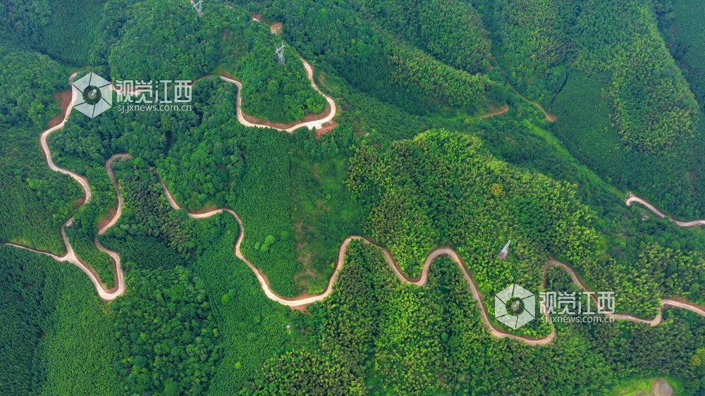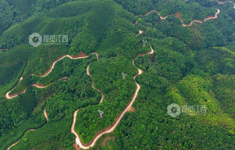 5月22日,俯瞰江西省吉安市泰和县老营盘镇竹富公路,蜿蜒穿越大山,白色的水泥路与绿色的植被相映成景,壮美如画。