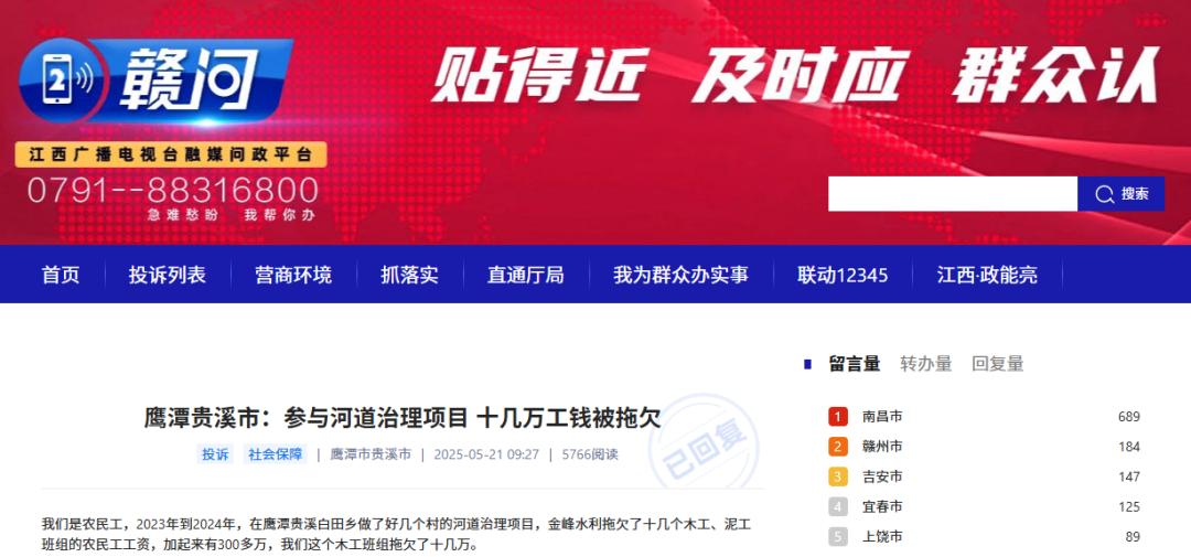 《赣问》平台转来的《鹰潭贵溪市:参与河道治理项目 十几万工钱被拖欠》已收悉。