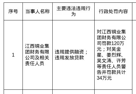 罚单显示,江西铜业集团财务有限公司的主要违法违规事实(案由)为:违规提供融资;违规发放贷款。