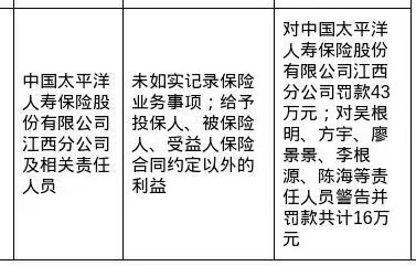 罚单显示,中国太平洋人寿保险股份有限公司江西分公司的主要违法违规行为是:未如实记录保险业务事项,给予投保人、被保险人、受益人保险合同约定以外的利益。