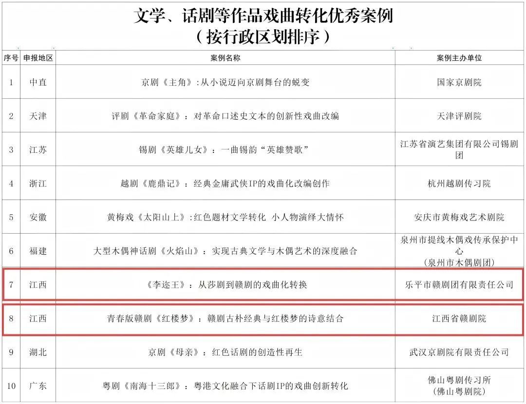 近日,文化和旅游部艺术司公布戏曲创作优秀案例,江西省文化和旅游厅精选推荐的2个案例入选,江西省赣剧院的“青春版赣剧《红楼梦》:赣剧古朴经典与红楼梦的诗意结合”和乐平市赣剧团有限责任公司的“《李迩王》:从莎剧到赣剧的戏曲化转换”入选文学、话剧等作品戏曲转化十佳案例。