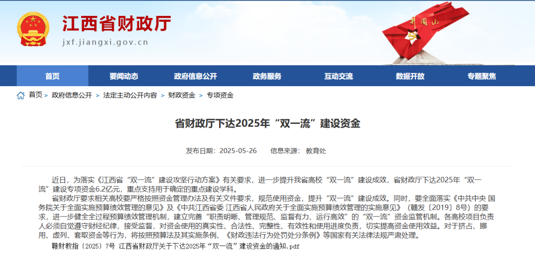 近日,为落实《江西省“双一流”建设攻坚行动方案》有关要求,进一步提升我省高校“双一流”建设成效,省财政厅下达2025年“双一流”建设专项资金6.2亿元,重点支持用于确定的重点建设学科。
