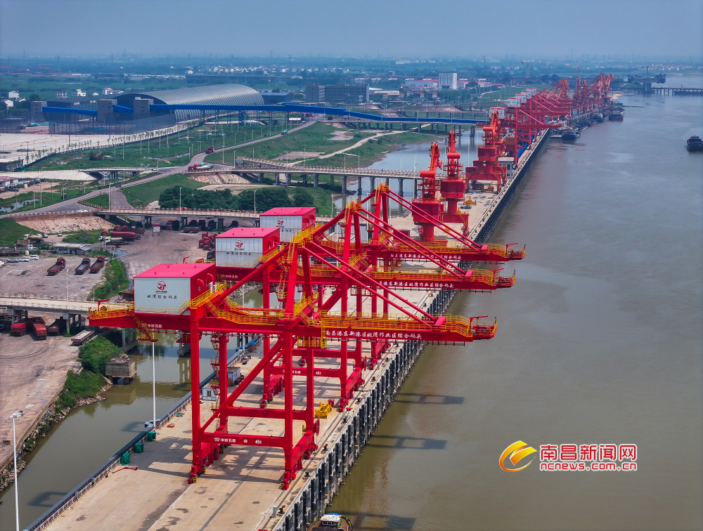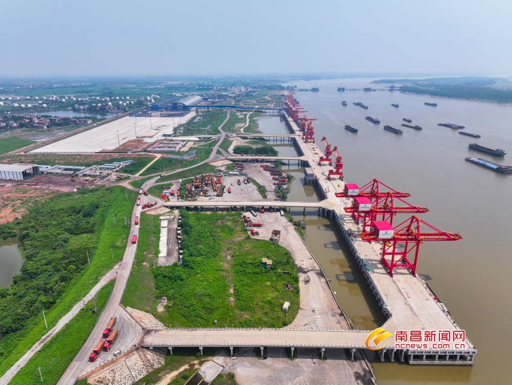 近日,记者在南昌姚湾综合码头看到,码头上,一排红色起重机整齐矗立,有序地进行货物装卸作业;江面上,货船往来穿梭,或等待靠岸卸货,或装满货物准备启航,展现出一派水运繁忙的景象。