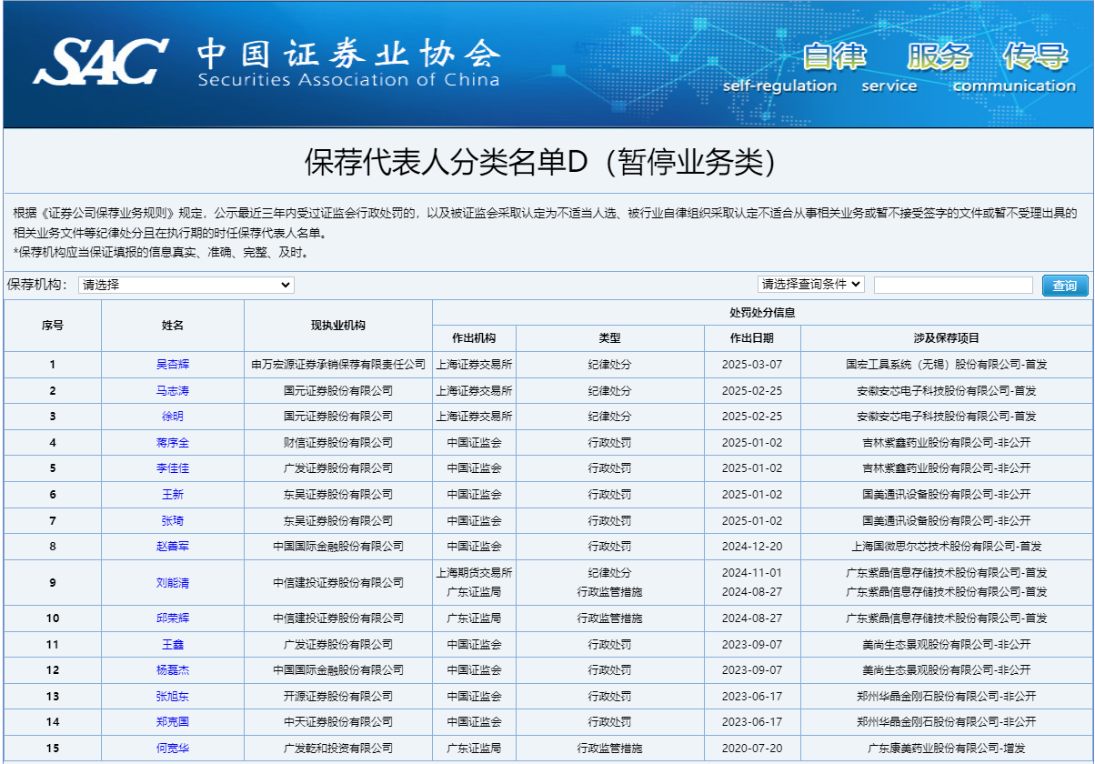 中国经济网北京5月28日讯 中国证券业协会网站近日更新了保荐代表人分类名单,其中D类(暂停业务类)名单新增8人。截至目前,D类名单总人数已达到15人。保荐代表人分类名单D(暂停业务类)显示,新增的8名保代分别来自申万宏源证券承销保荐有限责任公司、国元证券股份有限公司、财信证券股份有限公司、广发证券股份有限公司、东吴证券股份有限公司、中国国际金融股份有限公司6家券商。