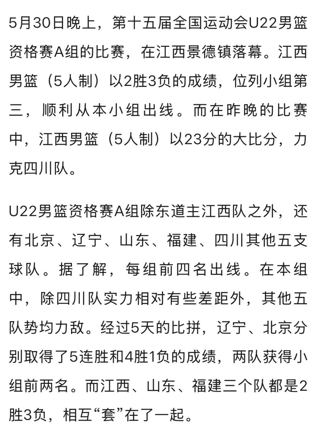 其中,江西89比104不敌福建、101比81战胜山东;另一场比赛,山东79比59战胜福建。通过计算小分,江西队净胜分为+5,山东队净胜分为0,福建队净胜分为-5。这样,目前2胜2负的江西U22男篮提前锁定小组前四名,挺进全运会正赛。这也是时隔38年后,江西男篮(5人)再次闯入全运会决赛圈。