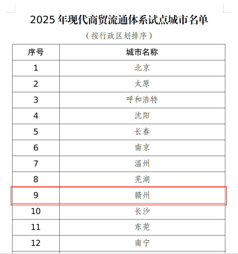 5月30日,财政部经济建设司公示了2025年现代商贸流通体系试点城市评选结果,全国20个城市入选,我省赣州市成功入围,这是我省继南昌市2024年首批入选后再次入围,将获中央补助资金2亿元。