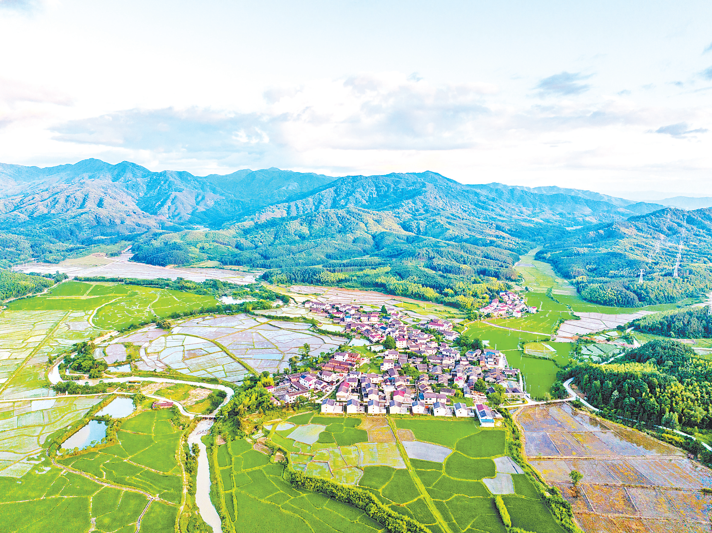 6月3日,金溪县黄通乡关王村一带,山清水秀、屋舍俨然,田园广阔、林木繁茂,生态美景宛如画卷。