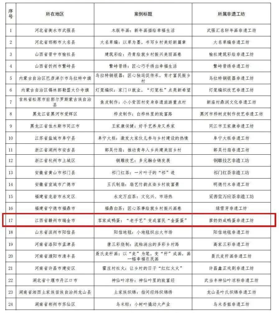 日前,文化和旅游部、人力资源社会保障部、农业农村部公布第二批“非遗工坊典型案例”名单,确定了51个典型案例。其中,赣州市瑞金市报送的案例《客家咸鸭蛋:“老手艺”变成富民“金蛋蛋”》入选。