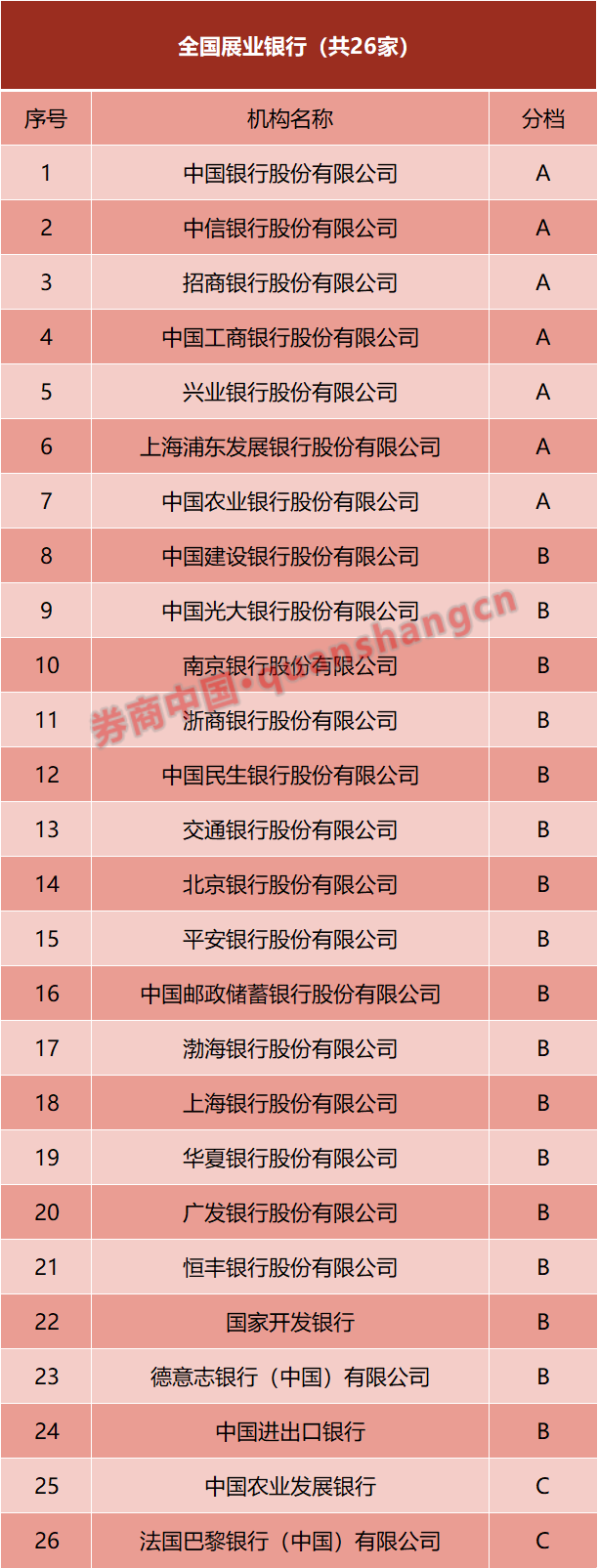 全国展业银行有26家,其中A类7家,C类2家,B类17家。地方展业银行28家,其中A类5家,B类18家,C类2家,D类3家。证券公司18家,A类5家,B类10家,C类3家。