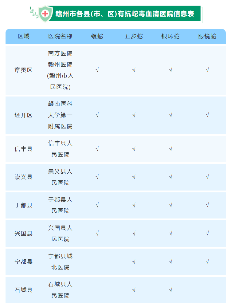 赣州市部分医院(见下表)24小时备有抗蛇毒血清,专业团队为您解毒。