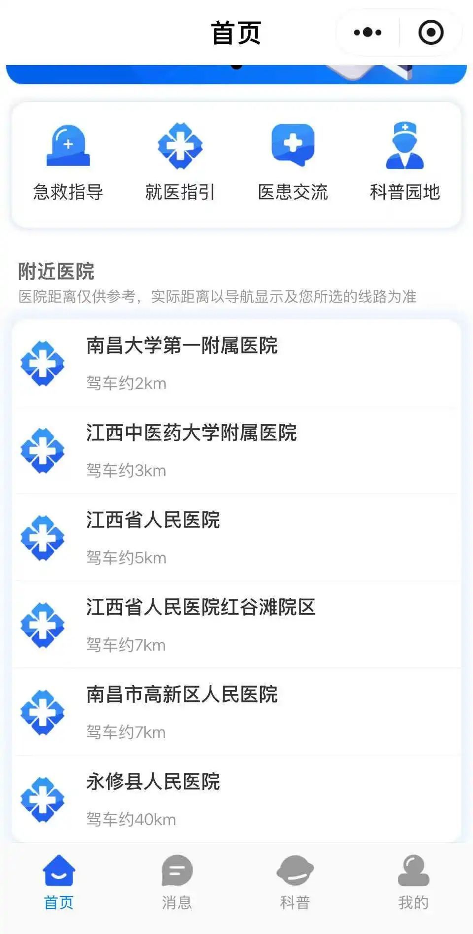 第三步,打开小程序,系统会自动定位,在首页下方“附近医院”一栏,按照距离远近,显示你所在位置附近的蛇伤救治医院。